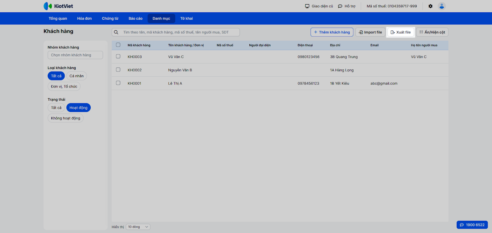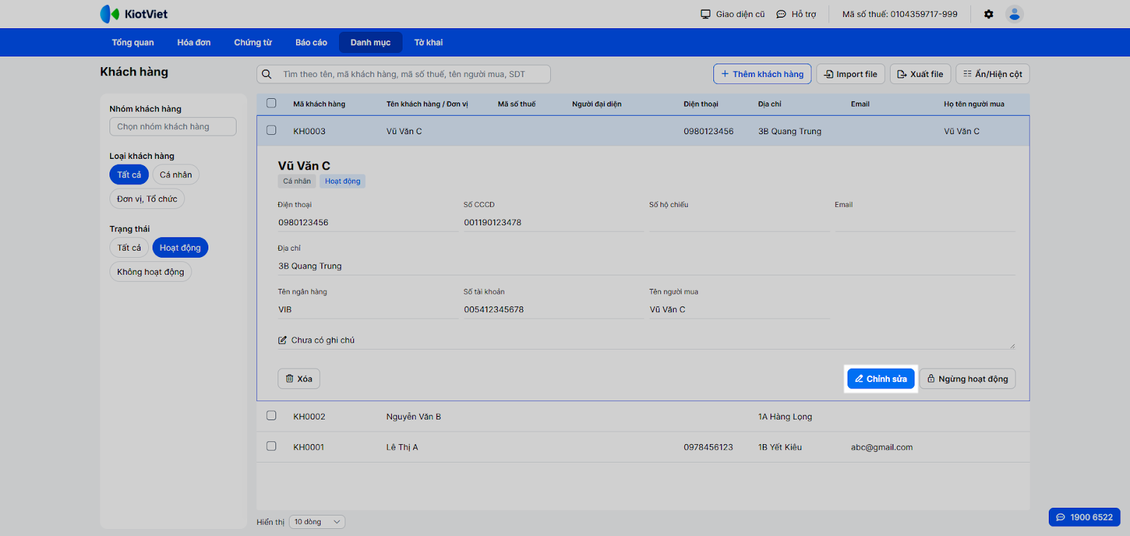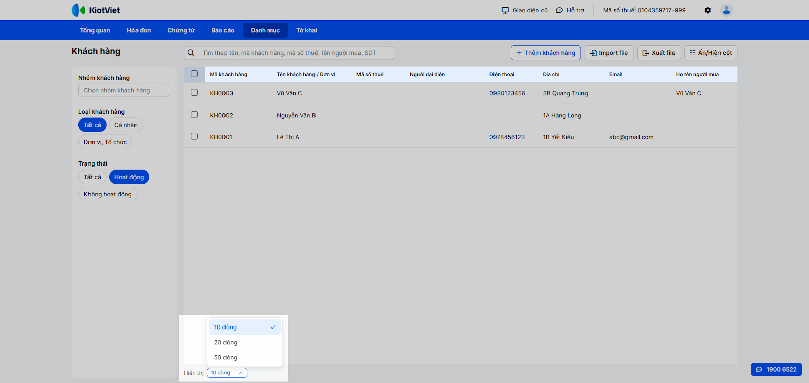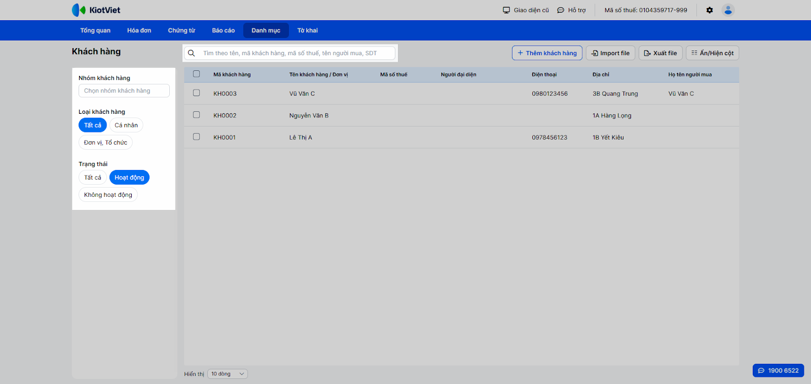 Quản lý danh mục khách hàng trên KiotViet eInvoice