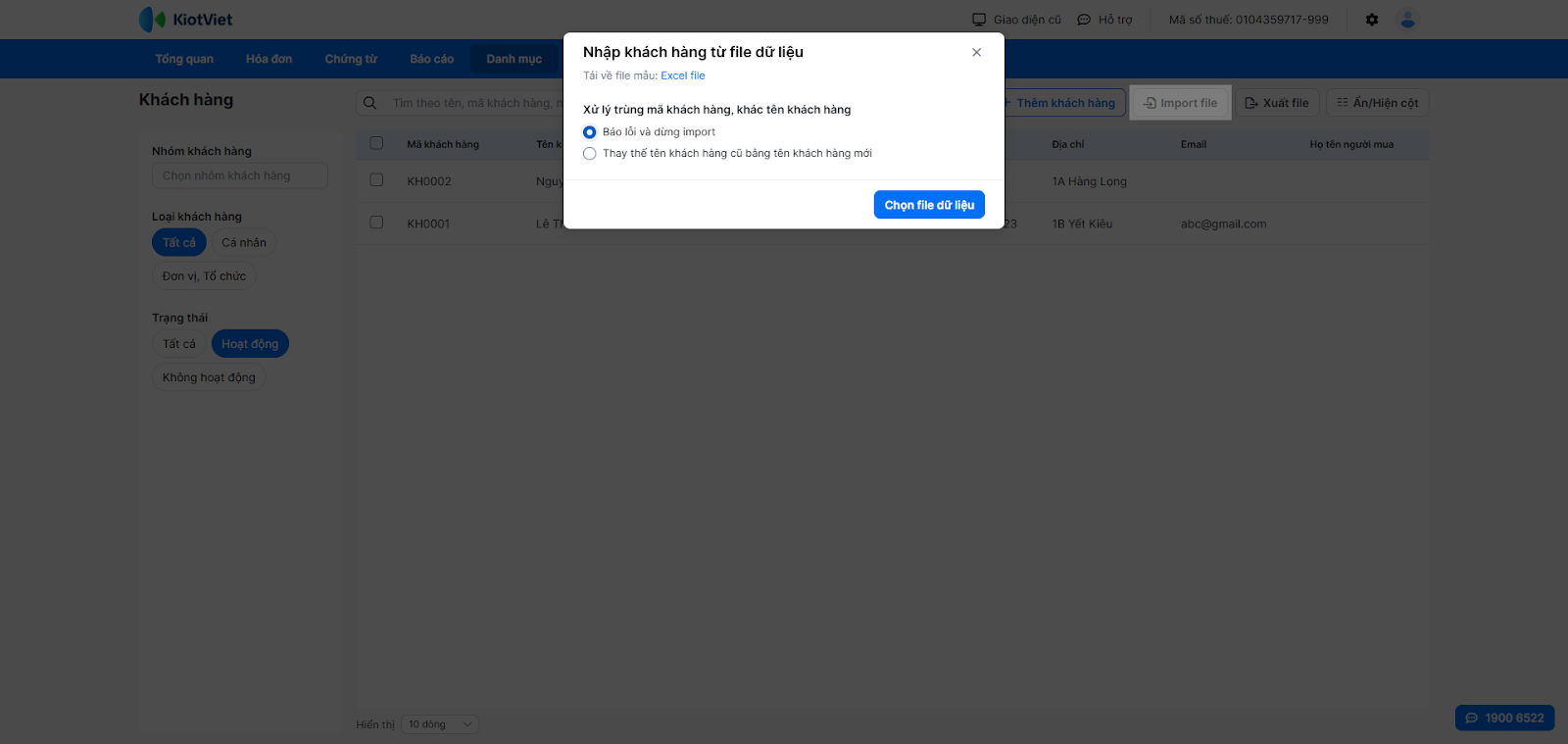 - Bước 2 – Tải dữ liệu lên hệ thống: Trên popup, bạn chọn quy tắc xử lý nếu Xử lý trùng mã khách hàng, khác tên khách hàng (Báo lỗi và dừng import hoặc Thay thế tên khách hàng cũ bằng tên khách hàng mới). Sau đó, nhấn Chọn file dữ liệu → kéo thả file hoặc tiếp tục nhấn Chọn file để đưa thông tin lên hệ thống.