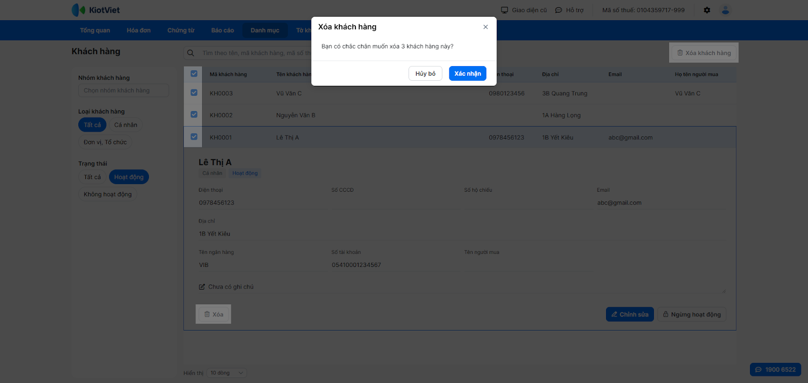 - Bước 3 – Xóa khách hàng: Để xóa khách hàng khỏi danh mục, bạn có thể nhấn Xóa khi xem chi tiết. Nếu cần xóa nhiều khách hàng cùng lúc, bạn tích chọn khách hàng → chọn Xóa khách hàng → nhấn Xác nhận.