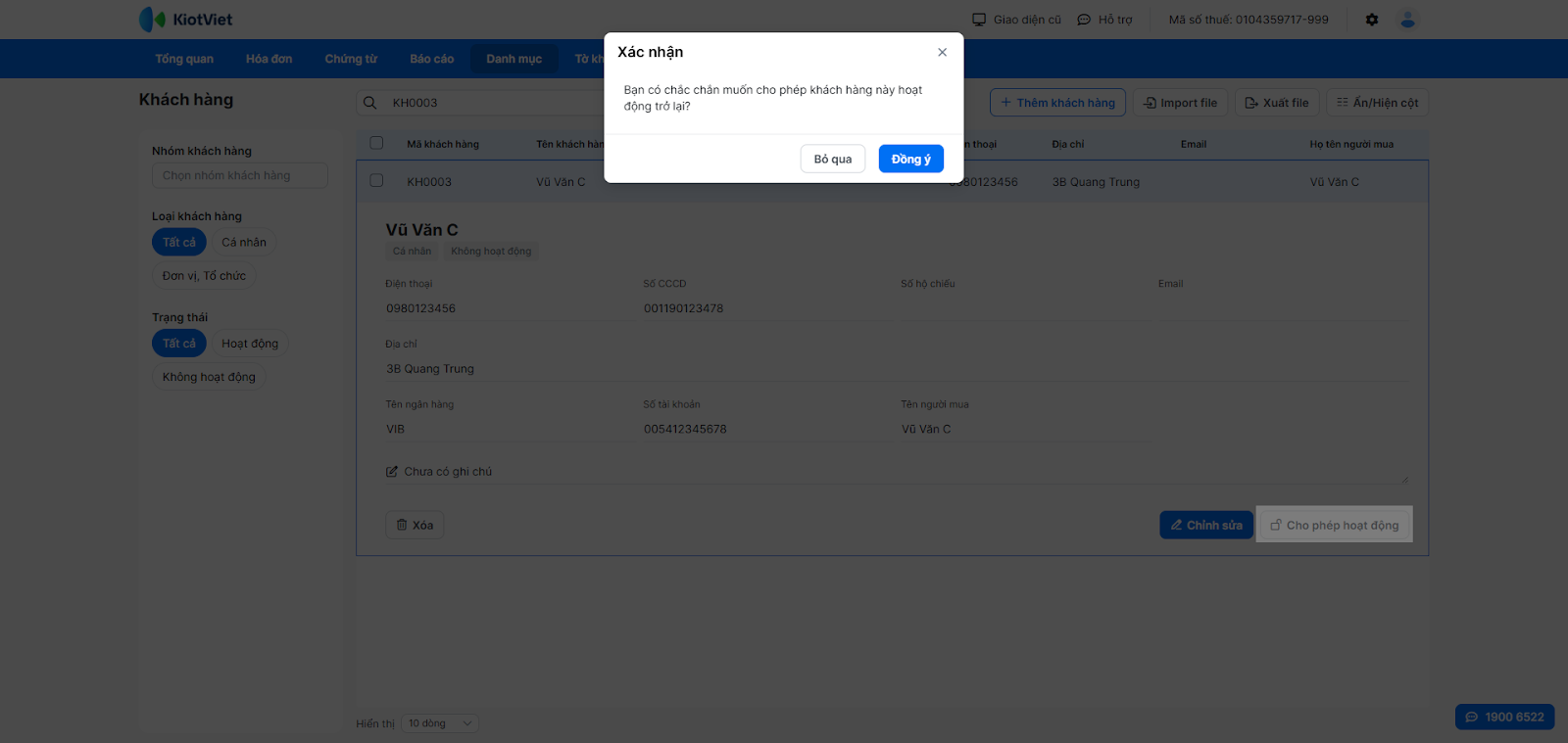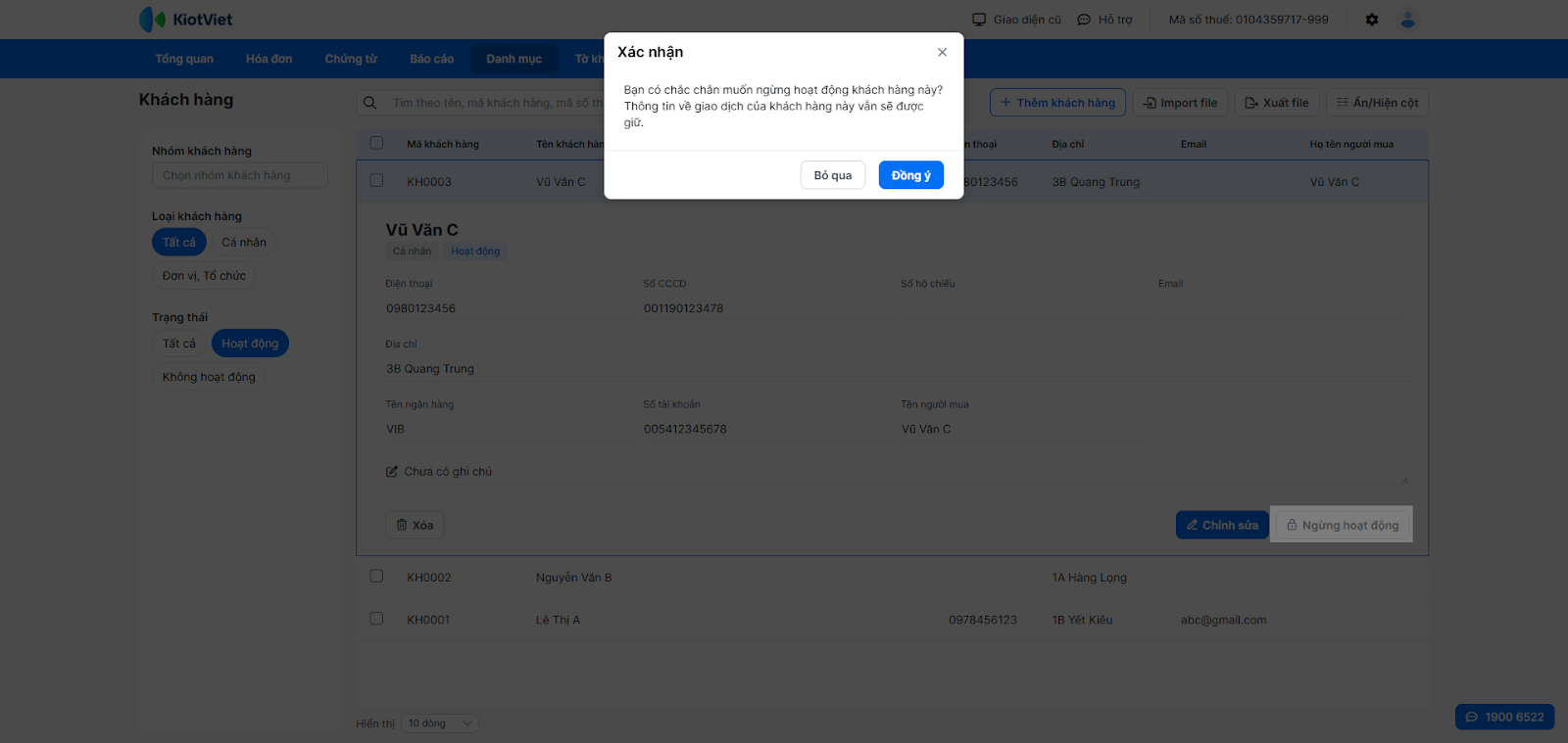 - Nếu khách hàng không còn giao dịch, khi xem chi tiết bạn nhấn Ngừng hoạt động → xác nhận Đồng ý.