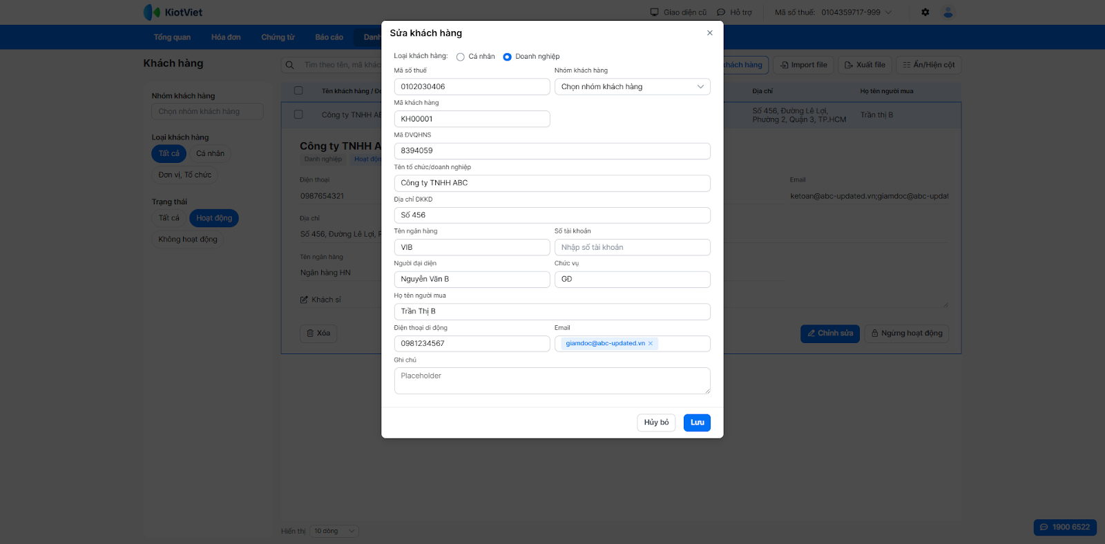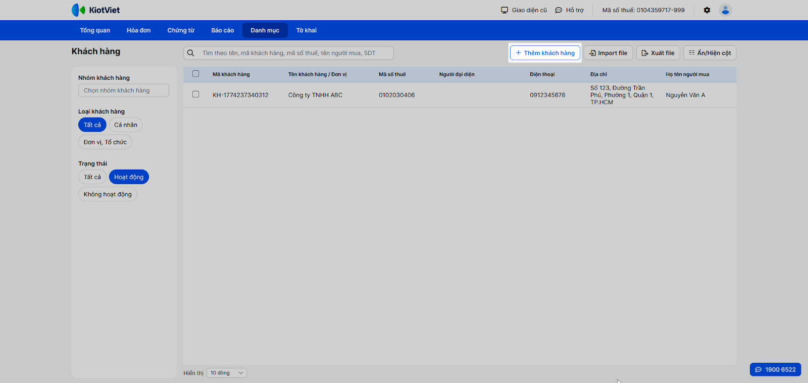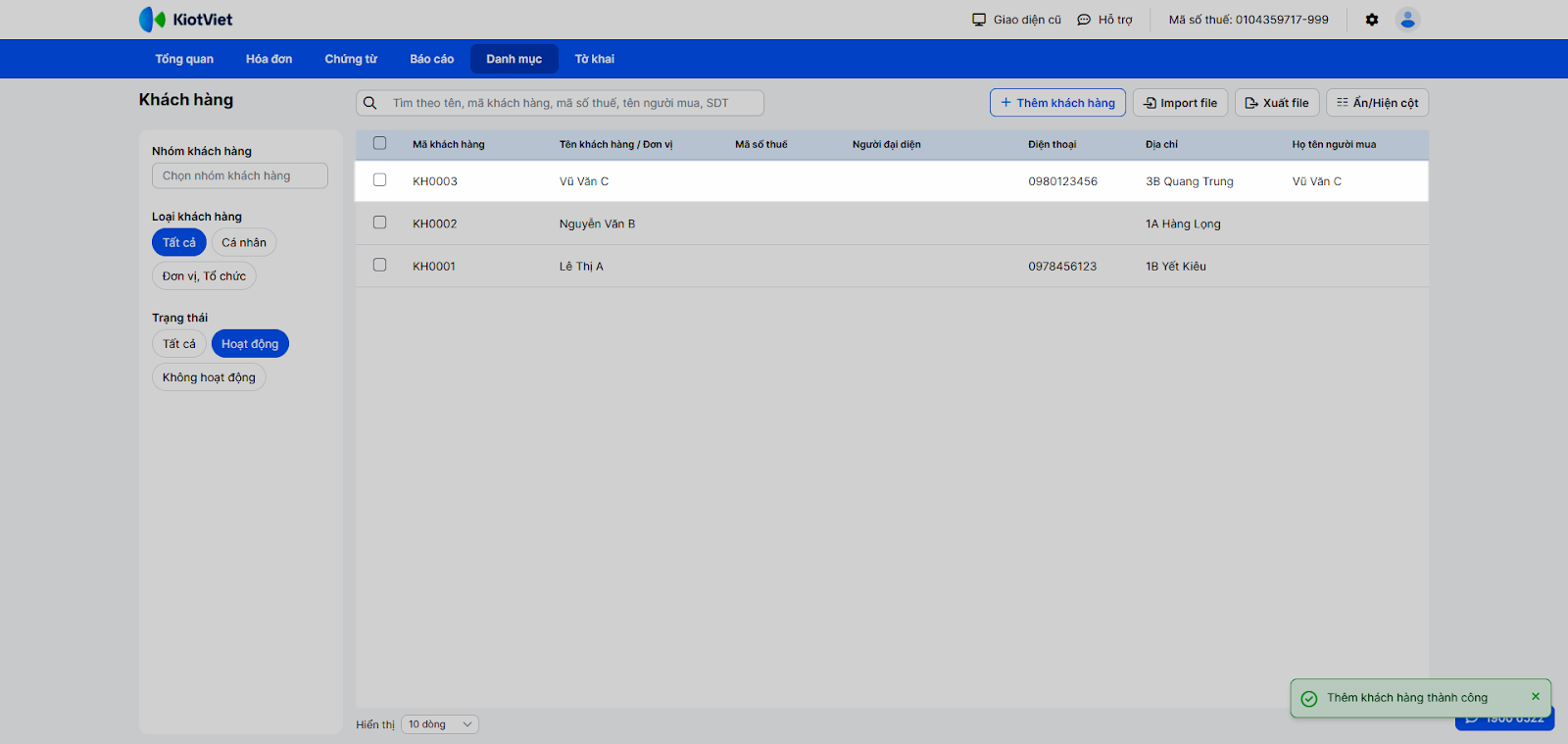 - Tình huống: Sau khi điền xong thông tin khách hàng, bạn lưu lại và muốn kiểm tra xem khách hàng này đã sẵn sàng để chọn khi xuất hóa đơn chưa.