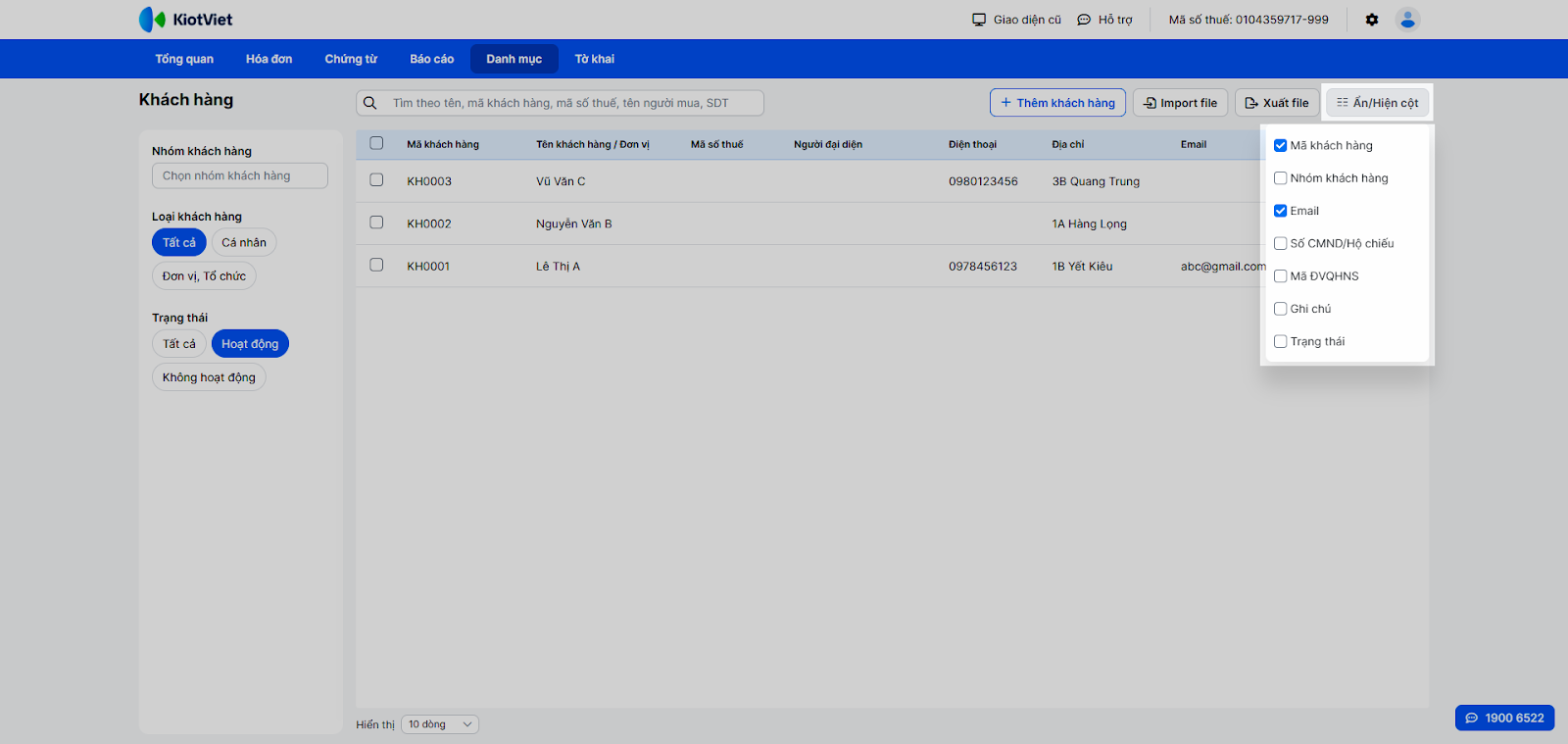 - Bước 2 – Tùy chỉnh cột hiển thị: Bạn nhấn Ẩn/Hiện cột ở góc trên bên phải màn hình → tích/bỏ tích chọn các thông tin (Mã khách hàng, Nhóm khách hàng, Email, Số CMND/Hộ chiếu, Mã ĐVQHNS, Ghi chú, Trạng thái) muốn hiển thị/ẩn trên danh sách Khách hàng.