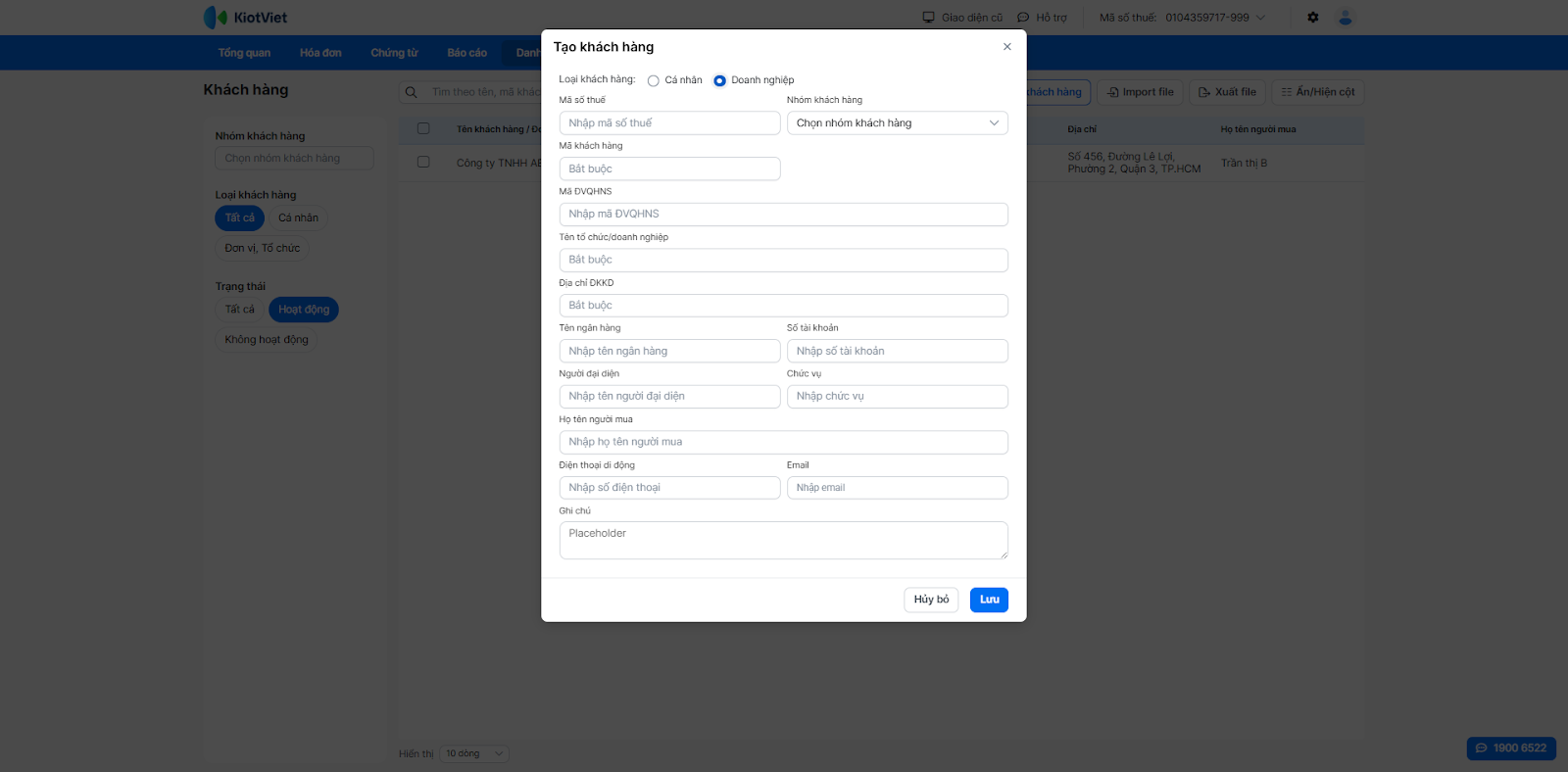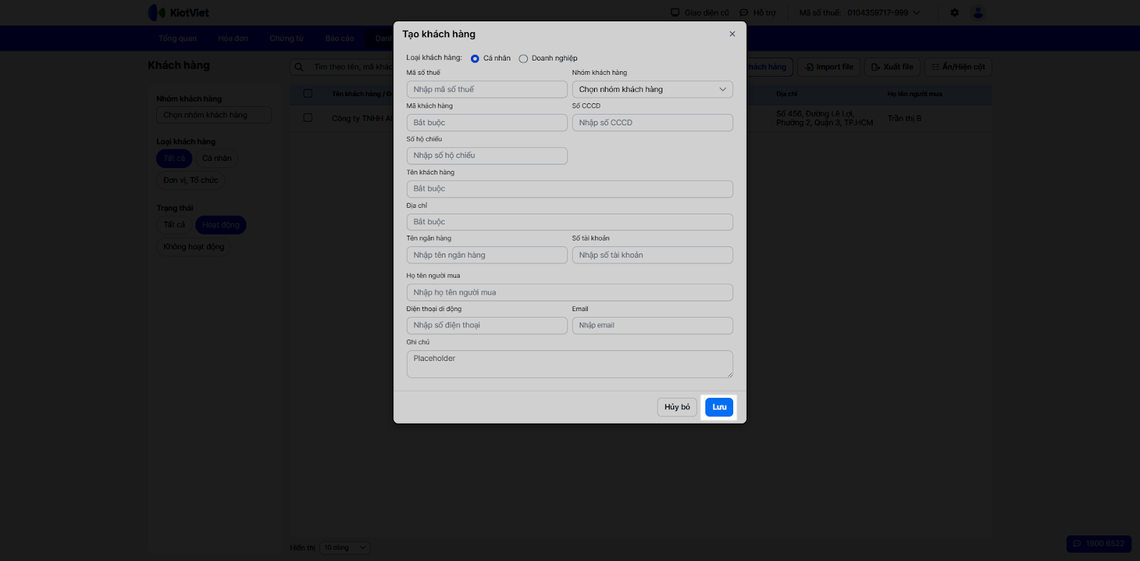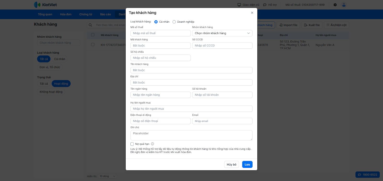 - Bước 3: Hệ thống hiển thị popup Tạo khách hàng.