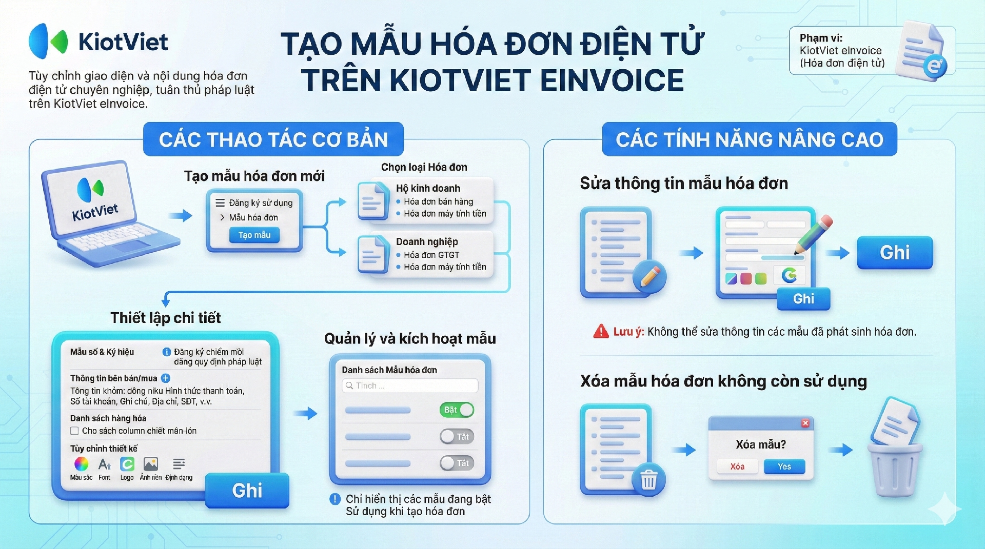 Tạo mẫu hóa đơn là một bước thiết lập quan trọng trong quy trình triển khai Hóa đơn điện tử KiotViet (KV-EINVOICE). Chức năng này cho phép người dùng tùy chỉnh giao diện và nội dung của hóa đơn điện tử trước khi phát hành, đảm bảo hóa đơn vừa thể hiện được hình ảnh thương hiệu của doanh nghiệp/hộ kinh doanh, vừa đáp ứng đầy đủ các yêu cầu pháp lý về thông tin hiển thị.