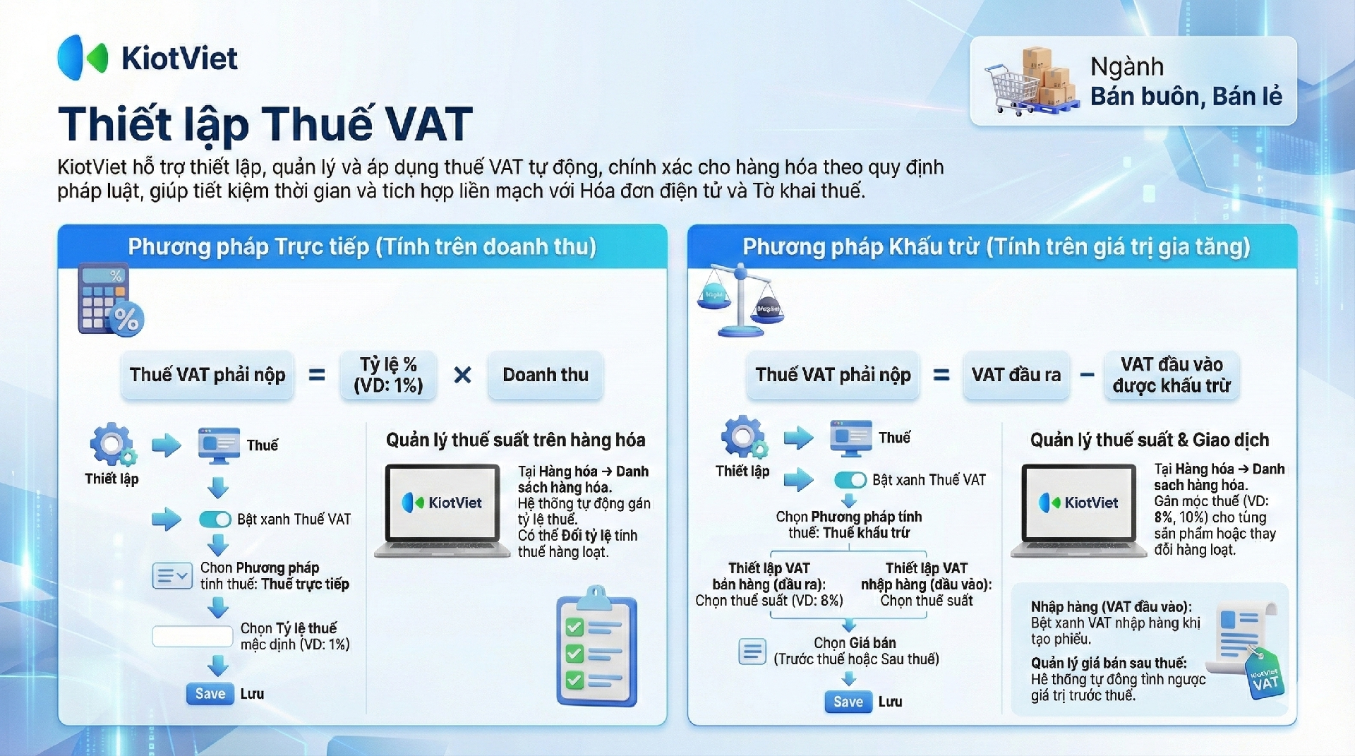 Trước khi đi vào cài đặt, bạn cần xác định phương pháp tính thuế mà cửa hàng của mình đang áp dụng. KiotViet hỗ trợ cả hai phương pháp theo quy định: