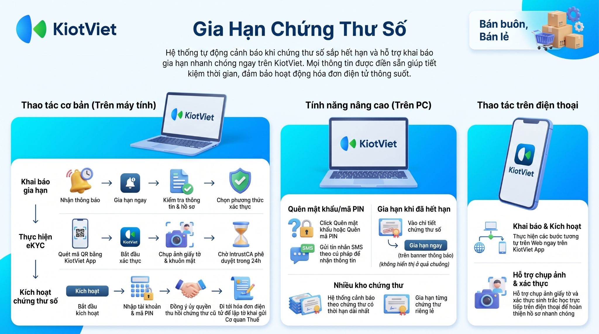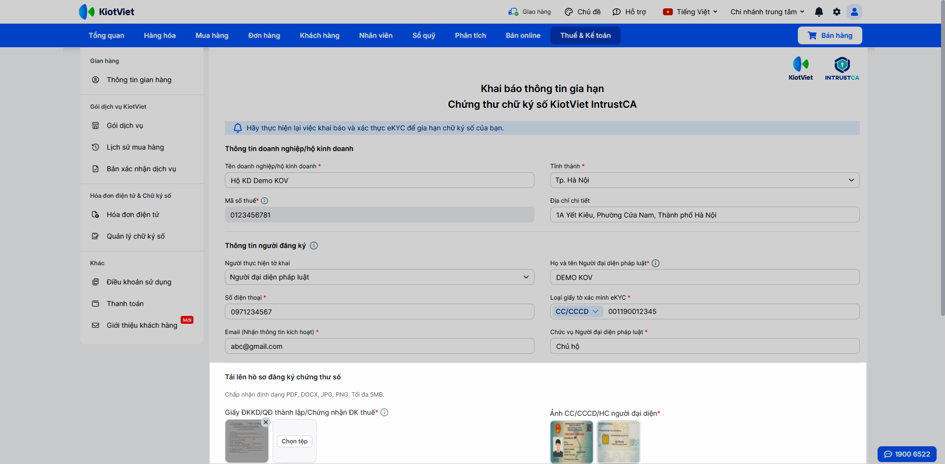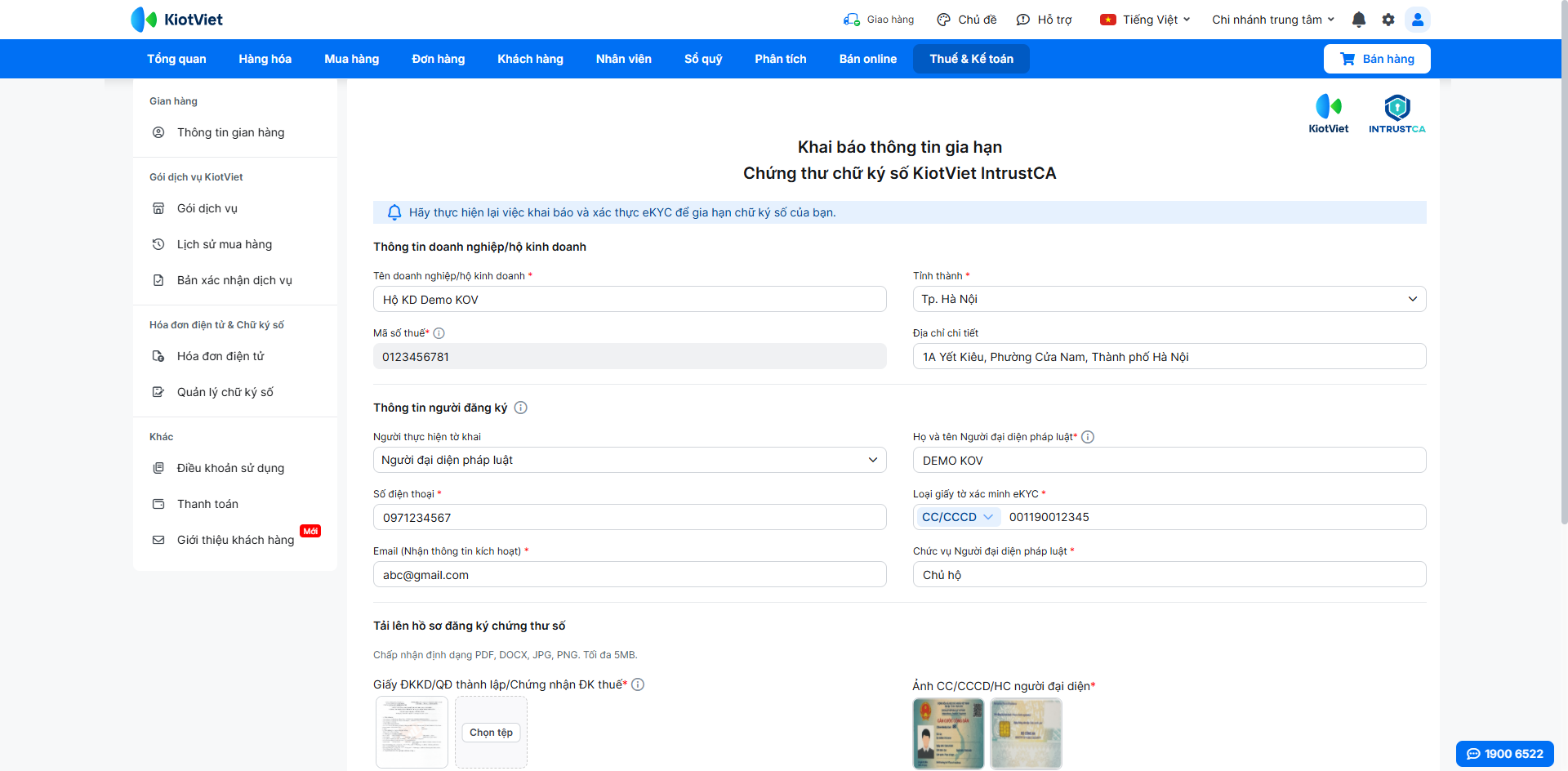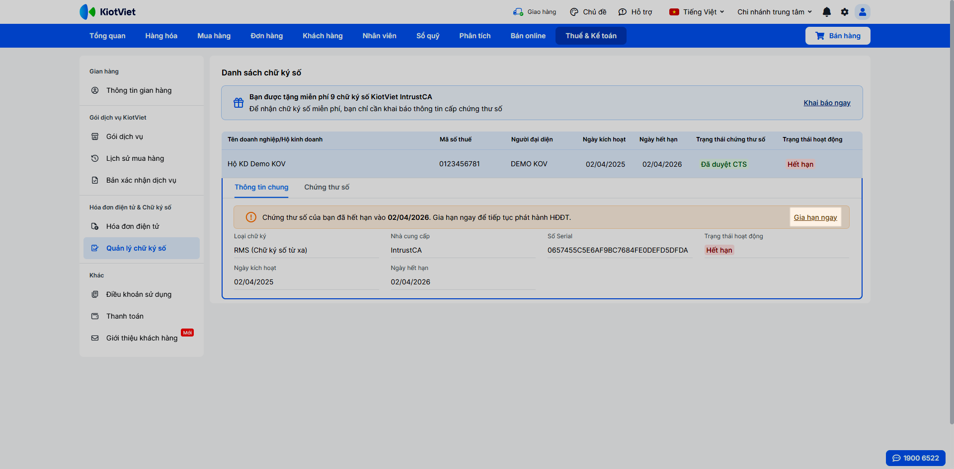 Tính năng này giúp tự động nhắc nhở trước khi chứng thư số hết hạn, đồng thời cho phép bạn thực hiện khai báo gia hạn ngay trên hệ thống KiotViet một cách nhanh chóng. Toàn bộ thông tin từ chứng thư số gốc sẽ được hệ thống tự động điền sẵn, giúp bạn không cần mất thời gian nhập liệu lại từ đầu.