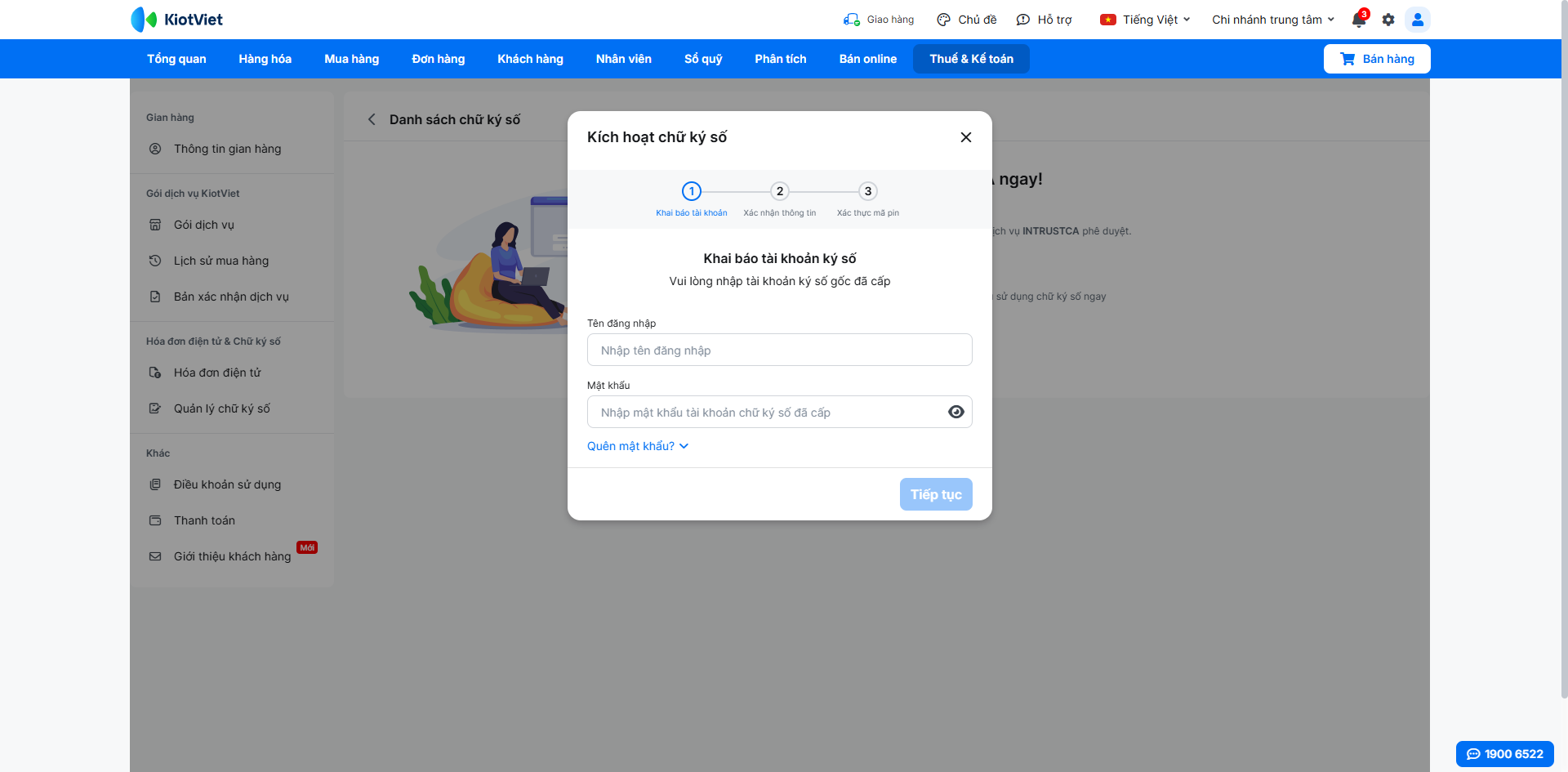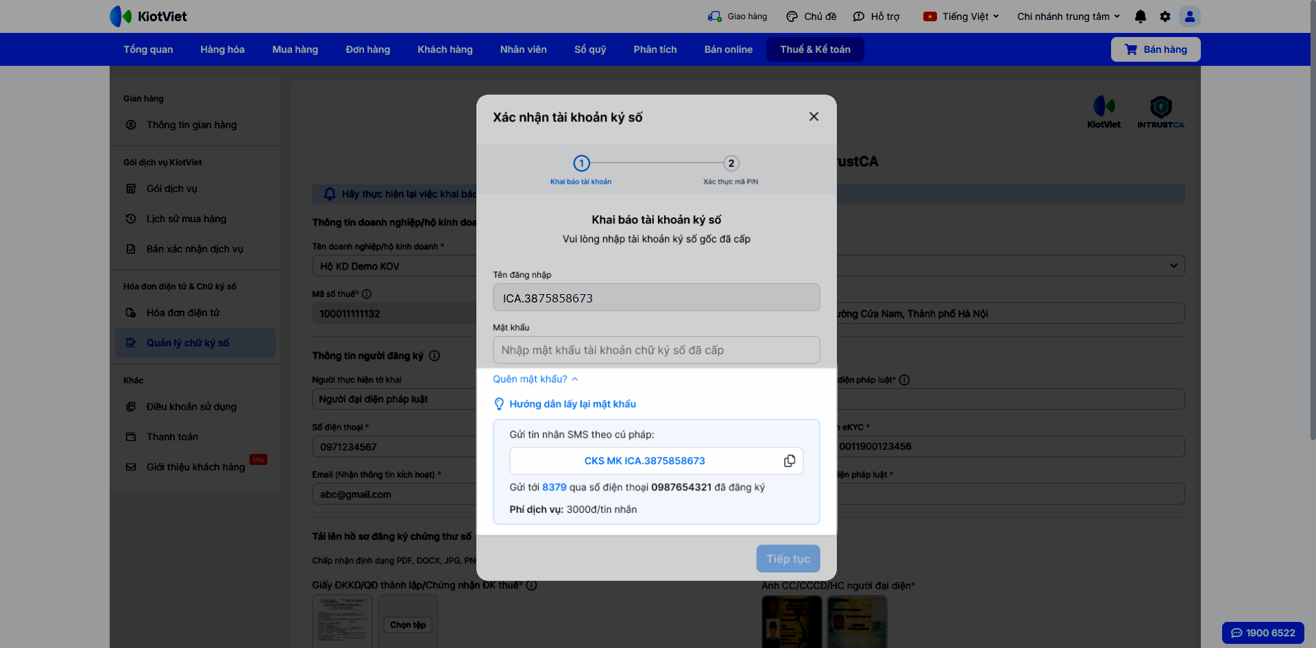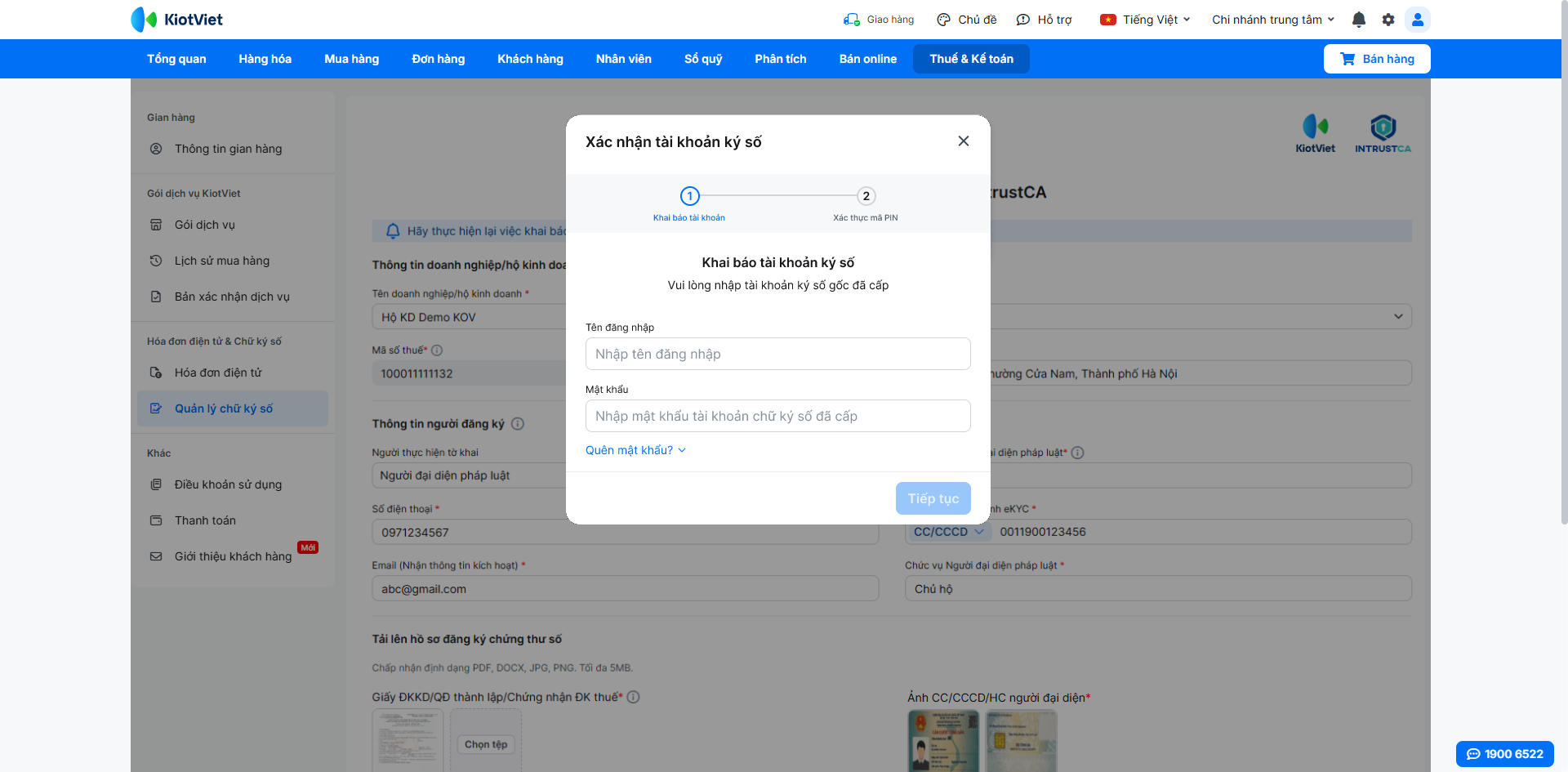 - Nếu bạn chọn phương thức Xác thực bằng chữ ký số KiotViet IntrustCA → hệ thống hiển thị popup để bạn nhập Tên đăng nhập, Mật khẩu của tài khoản ký số gốc đã được cấp → nhấn Tiếp tục.