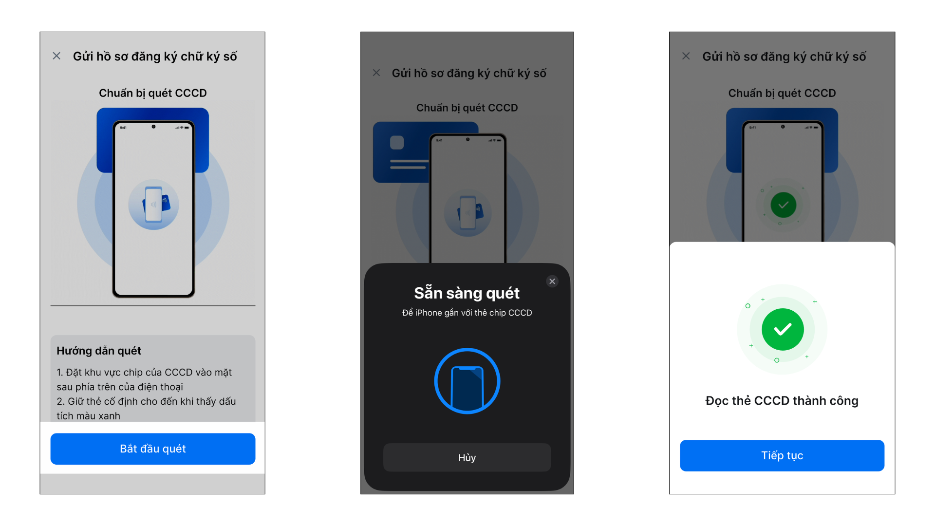 - Đối với CCCD gắn chíp: Tiếp tục quét chíp NFC trên thẻ (yêu cầu điện thoại có NFC).