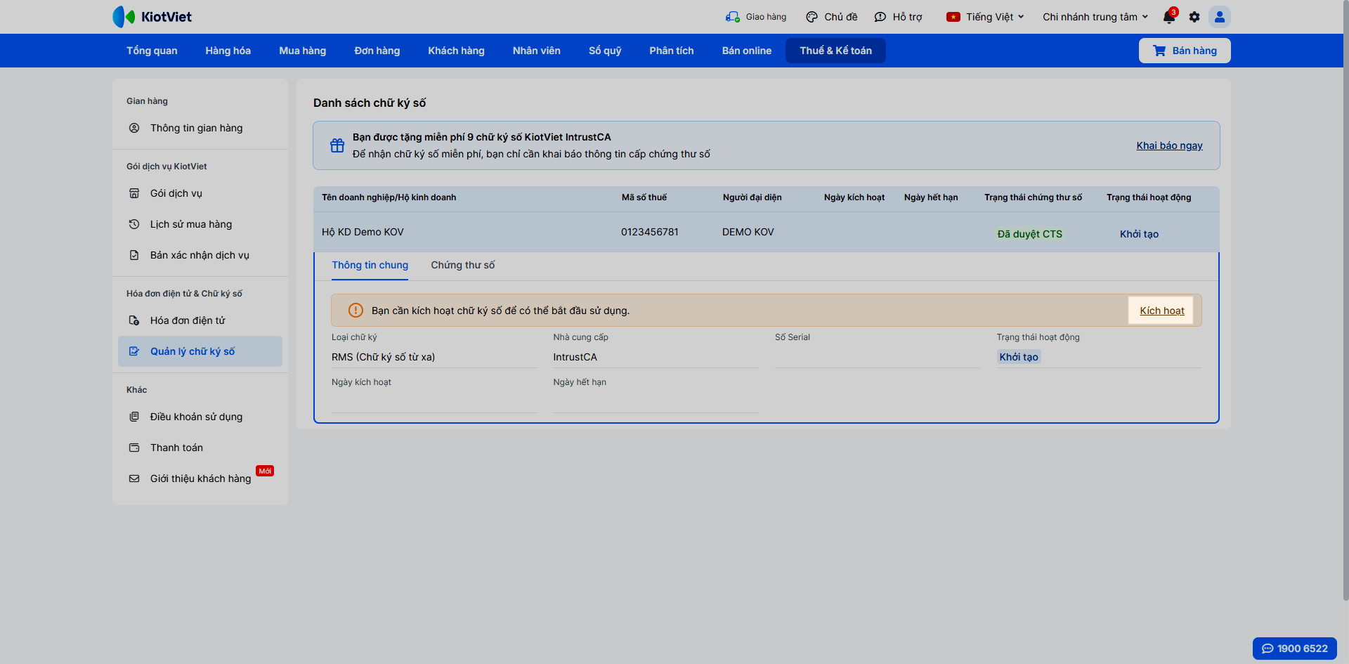 - Bước 1: Nhận thông báo kích hoạt. Khi chứng thư số chuyển sang trạng thái Khởi tạo, hệ thống sẽ gửi thông báo trong quả chuông và hiển thị banner trong chi tiết chữ ký số trên ứng dụng KiotViet. Bạn nhấn Kích hoạt.