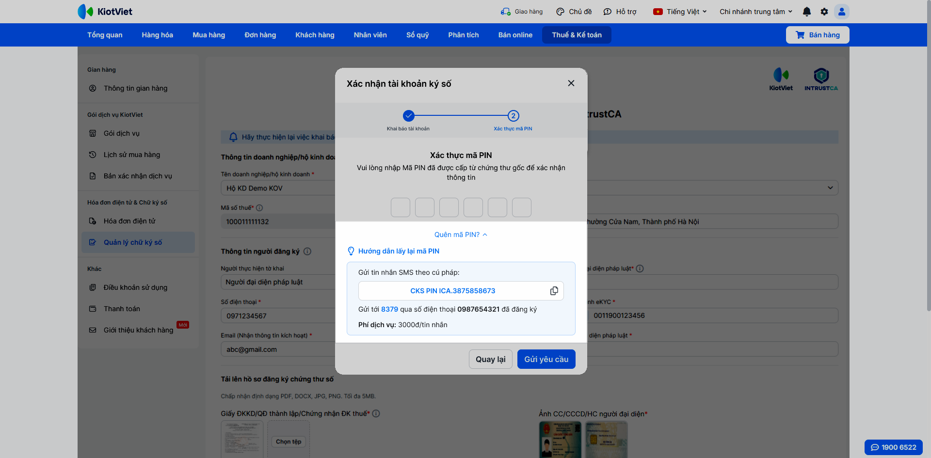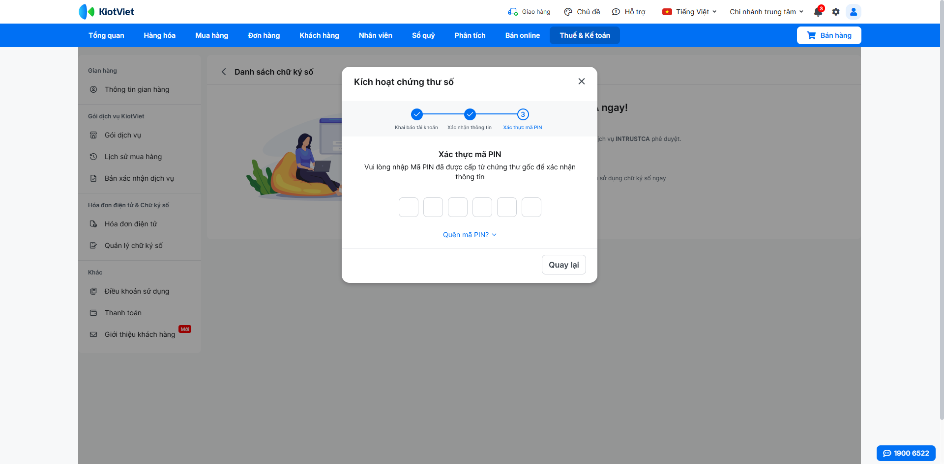 Tình huống: Trong quá trình khai báo thông tin gia hạn với phương thức Xác thực bằng chữ ký số KiotViet IntrustCA, hệ thống yêu cầu nhập mật khẩu, mã PIN để hoàn tất, nhưng bạn không nhớ các thông tin này khiến thao tác bị gián đoạn.