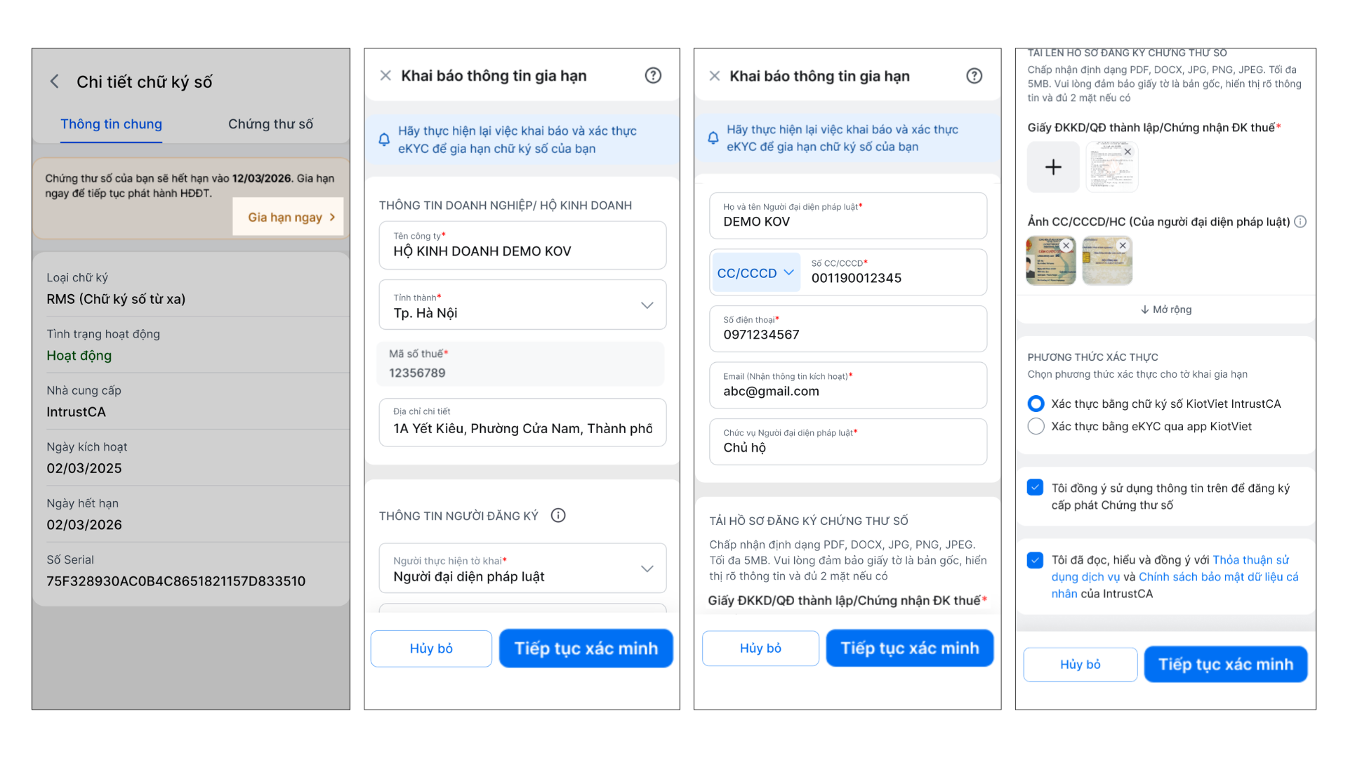 - Bước 1: Bạn nhấn vào Gia hạn ngay trên thông báo gia hạn trên ứng dụng KiotViet (tại popup/ banner trong chi tiết chữ ký số/ quả chuông thông báo) và thực hiện kiểm tra thông tin, hồ sơ tương tự như trên giao diện Web.