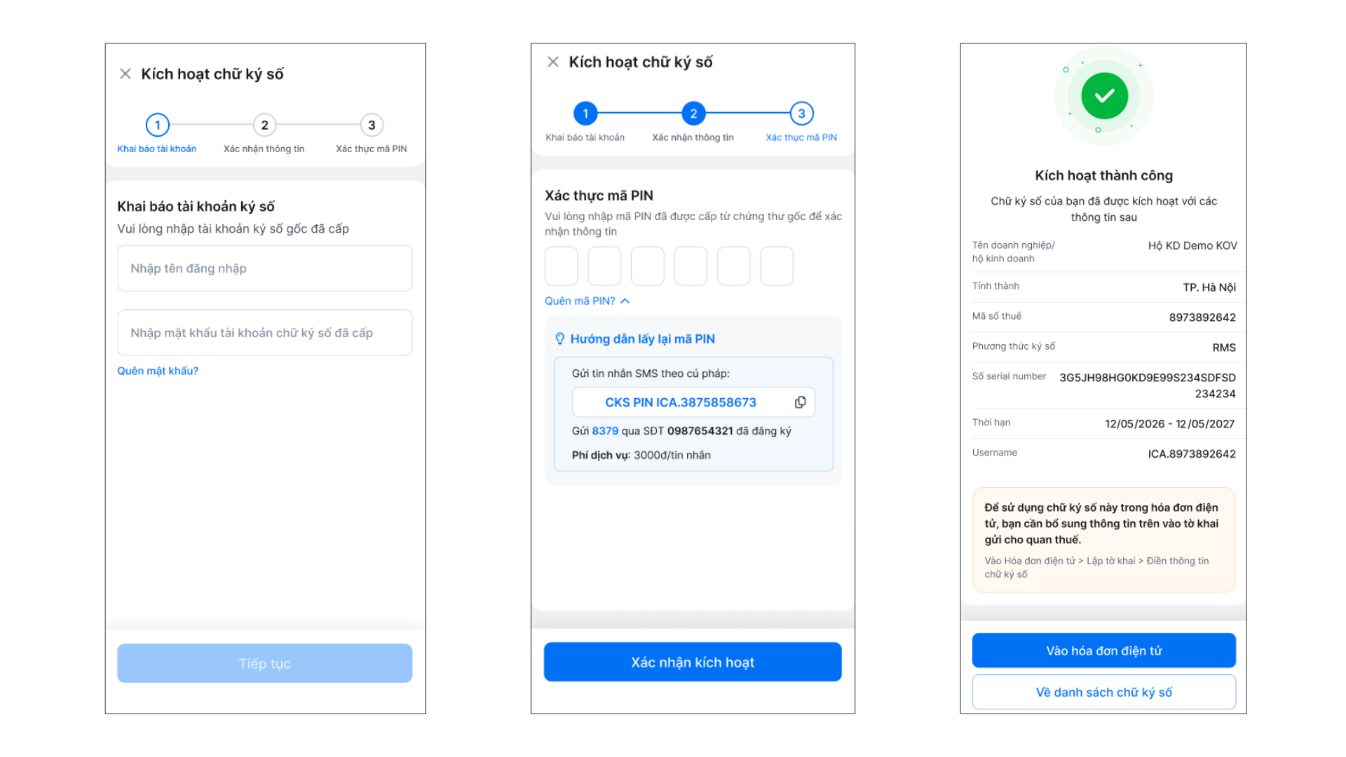 - Bước 6: Hoàn tất kích hoạt và lập tờ khai. Màn hình điện thoại hiển thị thông báo kích hoạt thành công. Để sử dụng chữ ký số mới, bạn tiếp tục chạm Vào hóa đơn điện tử → khai báo thông tin này vào Tờ khai đăng ký/thay đổi thông tin sử dụng hóa đơn điện tử gửi Cơ quan Thuế duyệt.