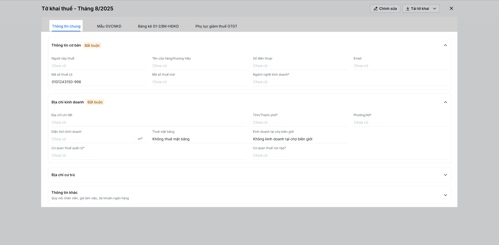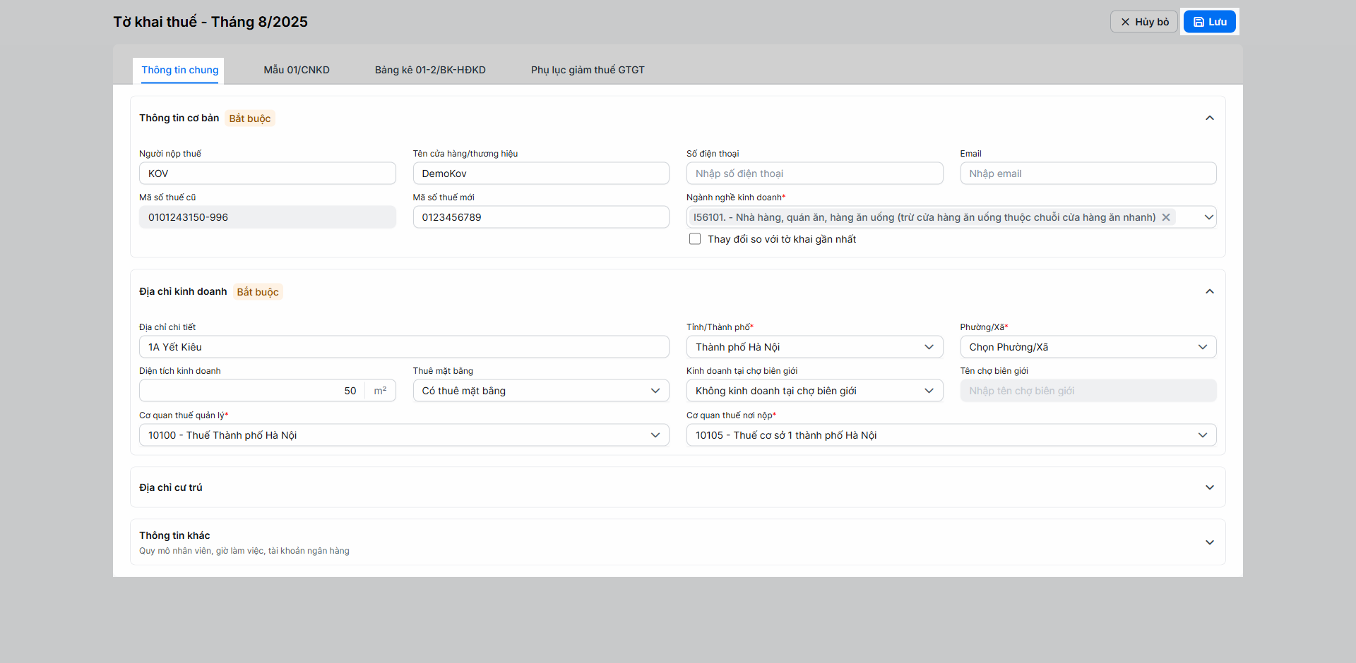 – Cửa hàng cần theo dõi các thông tin cơ bản, địa chỉ kinh doanh, địa chỉ cư trú cần hiển thị trên tờ khai 01/CNKD