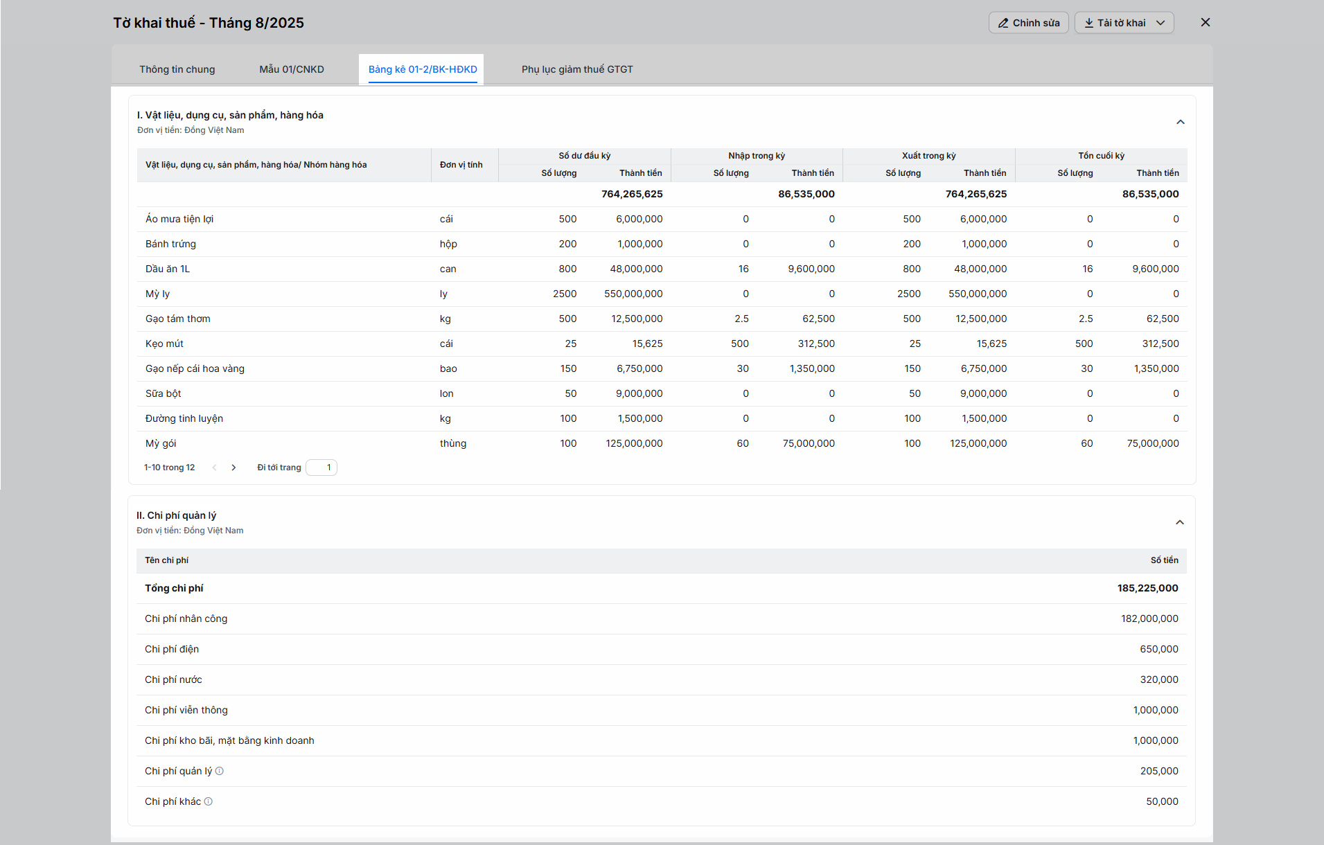 - Bao gồm các hàng hoá có quản lý tồn kho trên KiotViet, có ít nhất một trong ba số liệu xuất, nhập, tồn trong kỳ kê khai, không bao gồm: hàng dịch vụ combo. Hàng combo sẽ được ghi nhận theo hàng hóa thành phần.