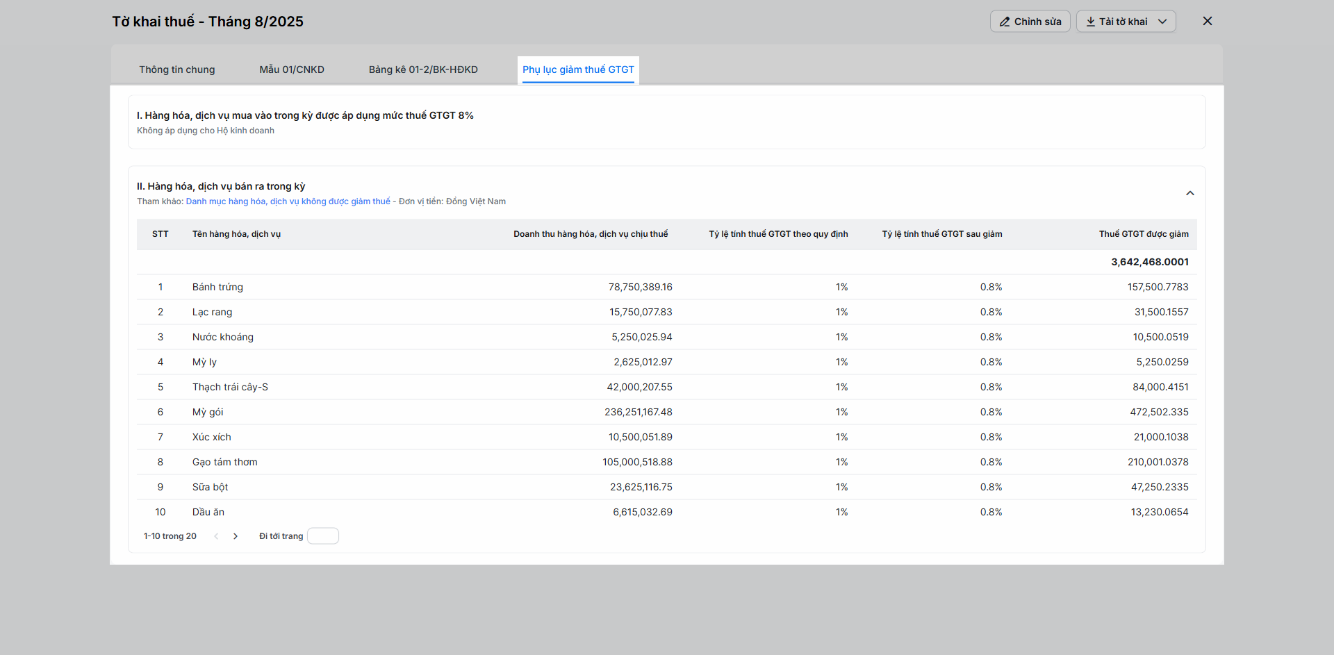 – Trong kỳ cửa hàng có giao dịch bán hàng có giảm thuế, phụ lục này sẽ tự động tổng hợp các giao dịch đó để đảm bảo bạn được hưởng đúng quyền lợi về thuế.