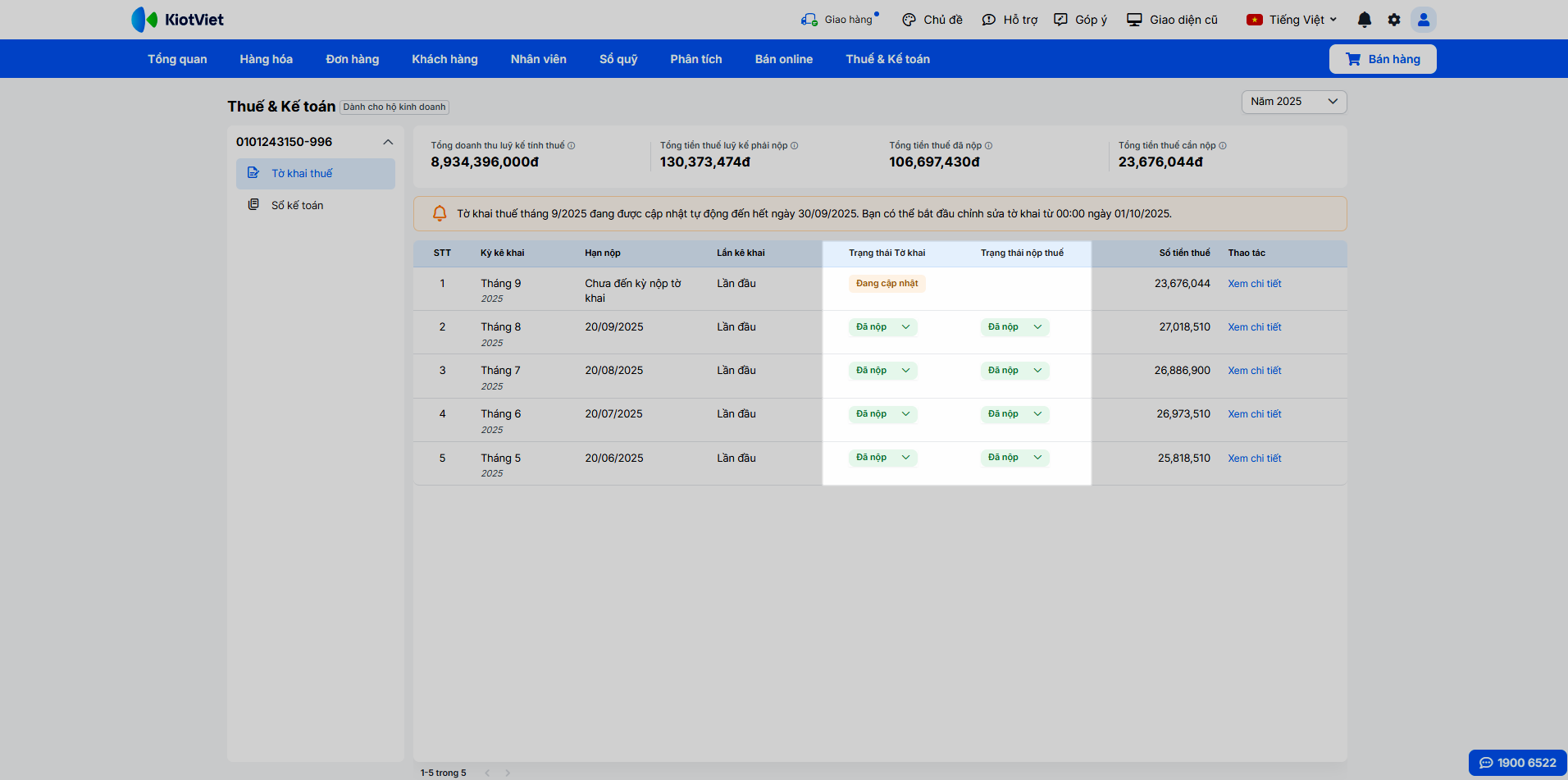 - Hệ thống tự động tổng hợp Doanh thu từ các giao dịch bán hàng trên KiotViet có phát hành hóa đơn điện tử trong kỳ và tự động tính toán số Thuế GTGT và TNCN phải nộp.