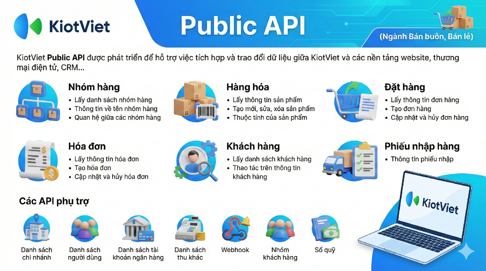 KiotViet Public API được phát triển để hỗ trợ việc tích hợp và trao đổi dữ liệu giữa KiotViet và các nền tảng website, thương mại điện tử, CRM…