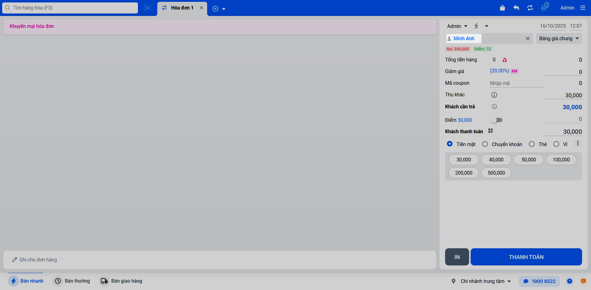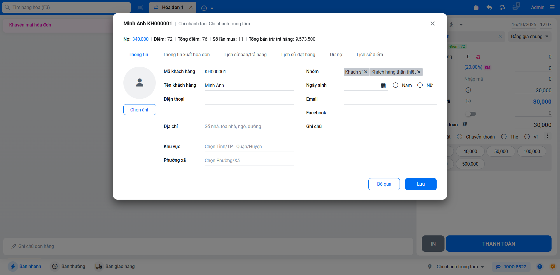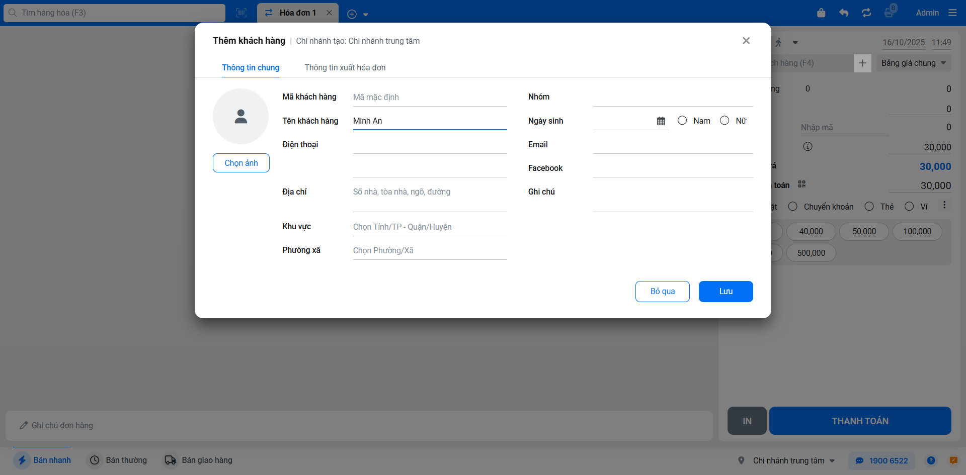 - Tình huống: Khi bán hàng, bạn cần thêm nhanh khách hàng mới hoặc chọn khách hàng cũ vào hóa đơn.