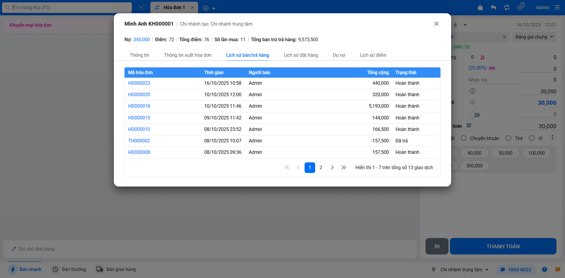 Ngoài ra, bạn cũng có thể xem thông tin lịch sử giao dịch của khách ngay trên màn hình Bán hàng.