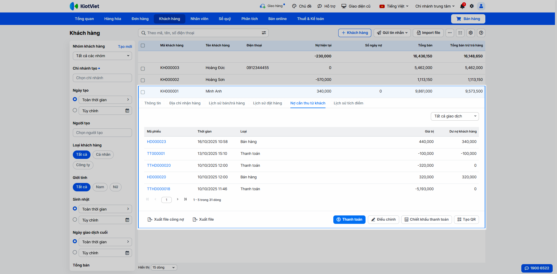 - Trong tab Nợ cần thu từ khách, nhấn nút Thanh toán.