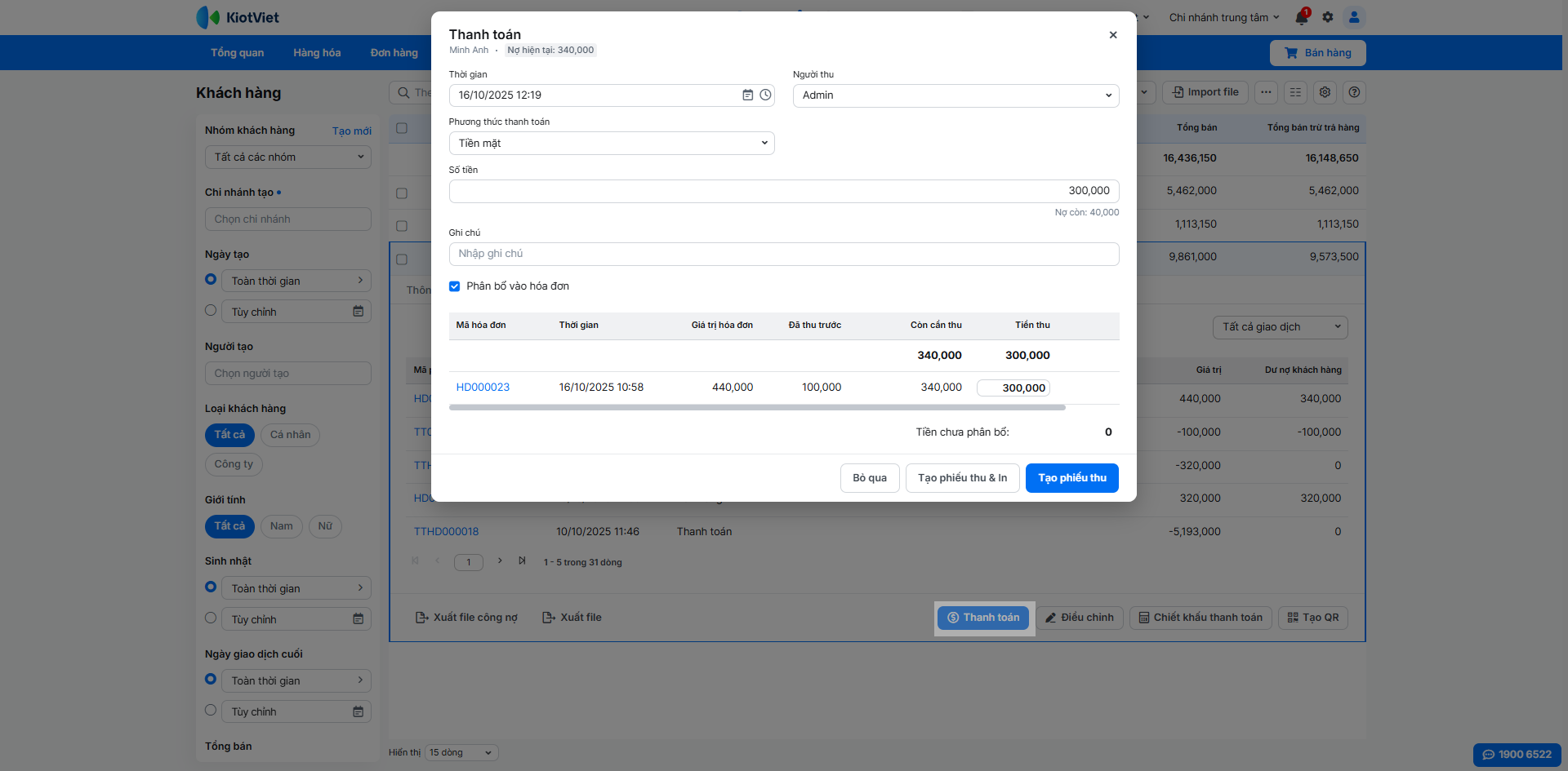 - Nhập số tiền khách trả vào ô Thu từ khách (hệ thống sẽ tự động phân bổ vào các hóa đơn cũ trước) hoặc nhập trực tiếp vào từng hóa đơn.
