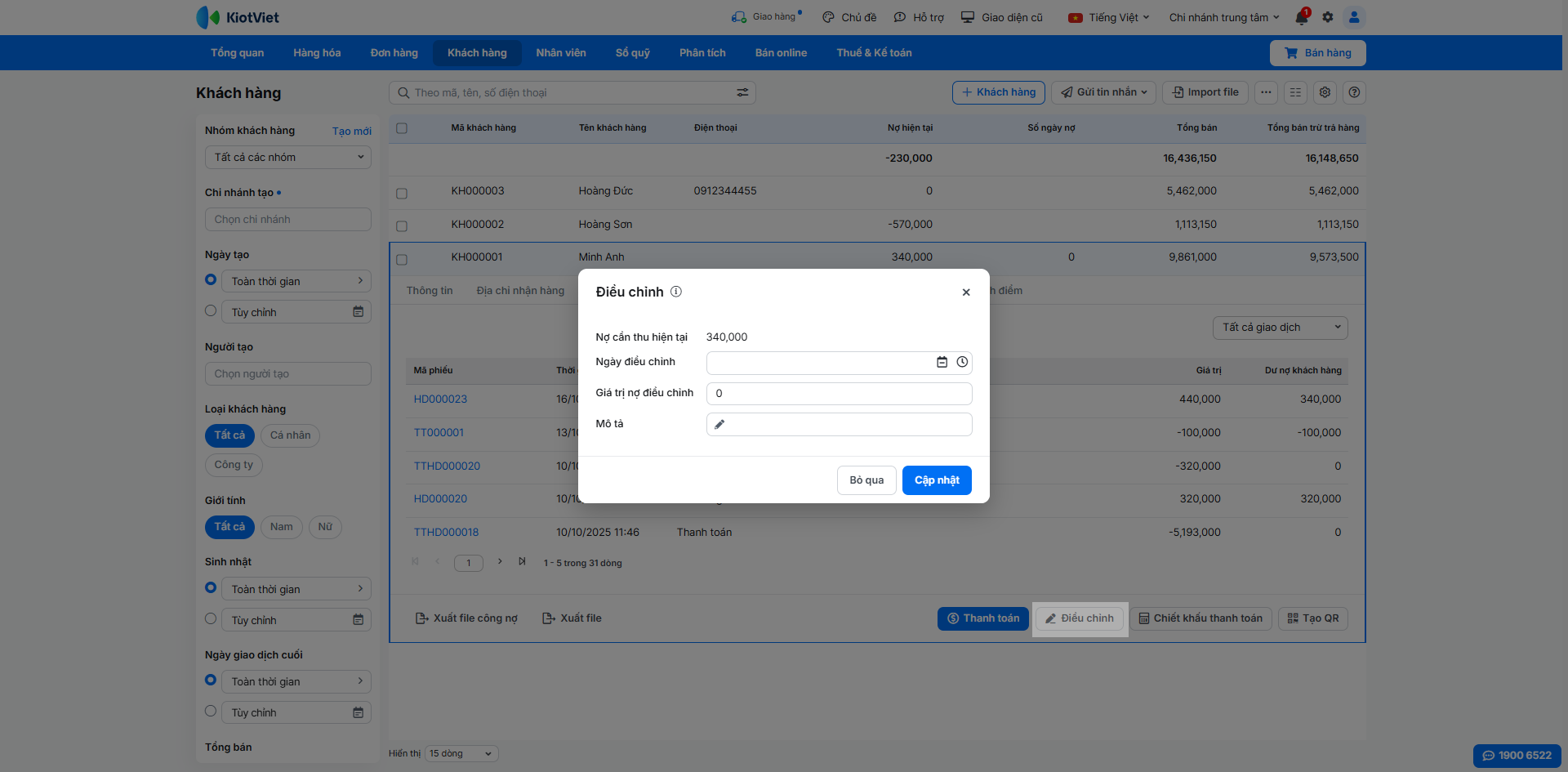 - Trong tab Nợ cần thu từ khách, nhấn nút Điều chỉnh.