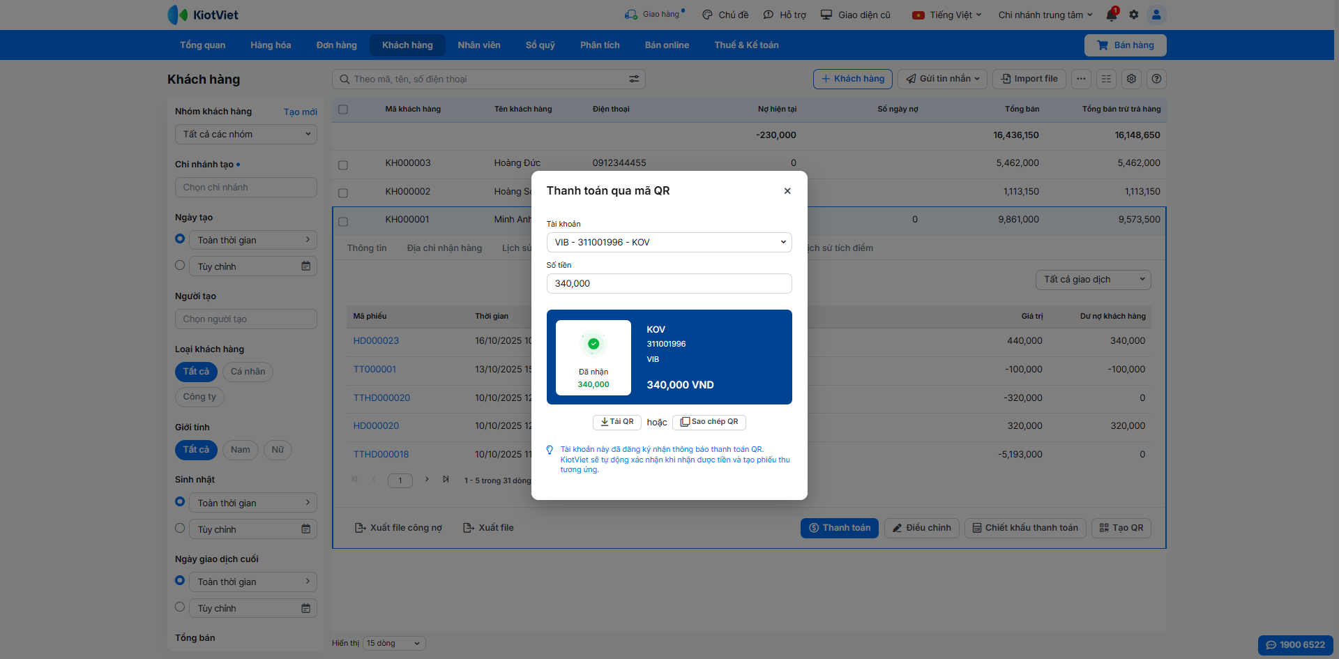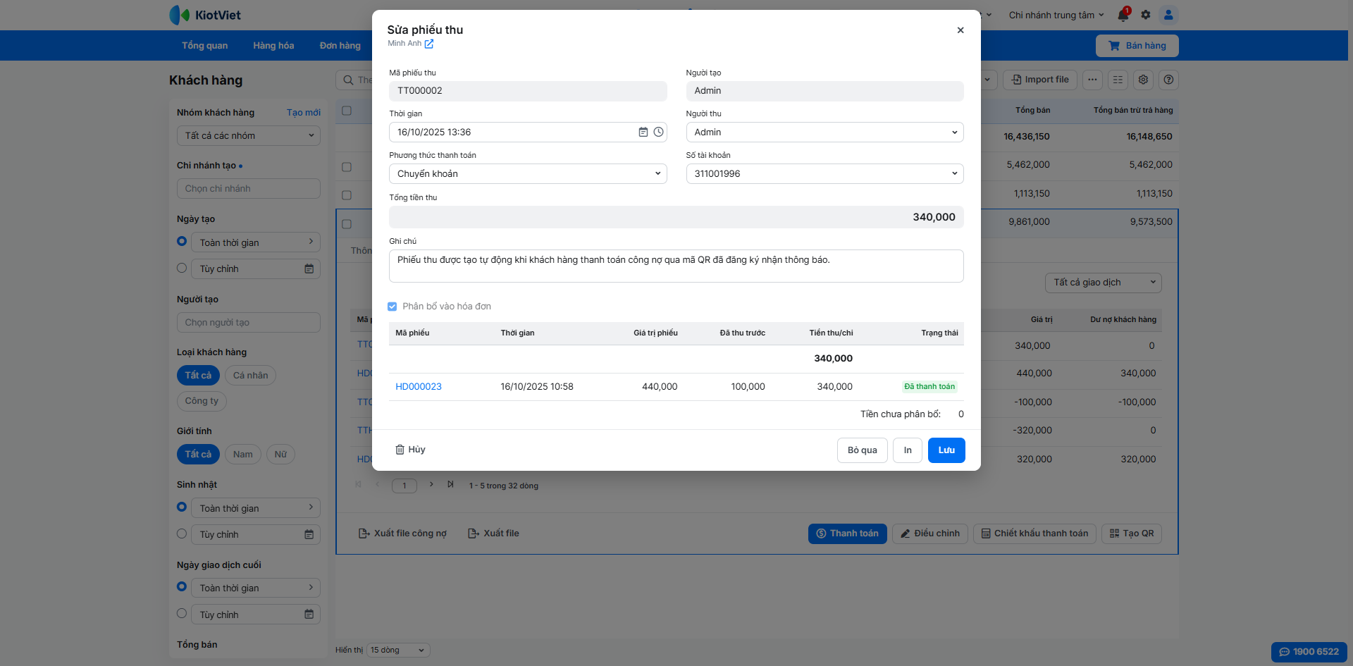 - Đối với tài khoản ĐÃ đăng ký nhận thông báo thanh toán QR → hệ thống sẽ tự động xác nhận và Tự động tạo phiếu thu công nợ khách hàng, phân bổ vào hóa đơn nợ (nếu có) theo thứ tự hóa đơn nợ trước trả trước khi nhận được tiền.