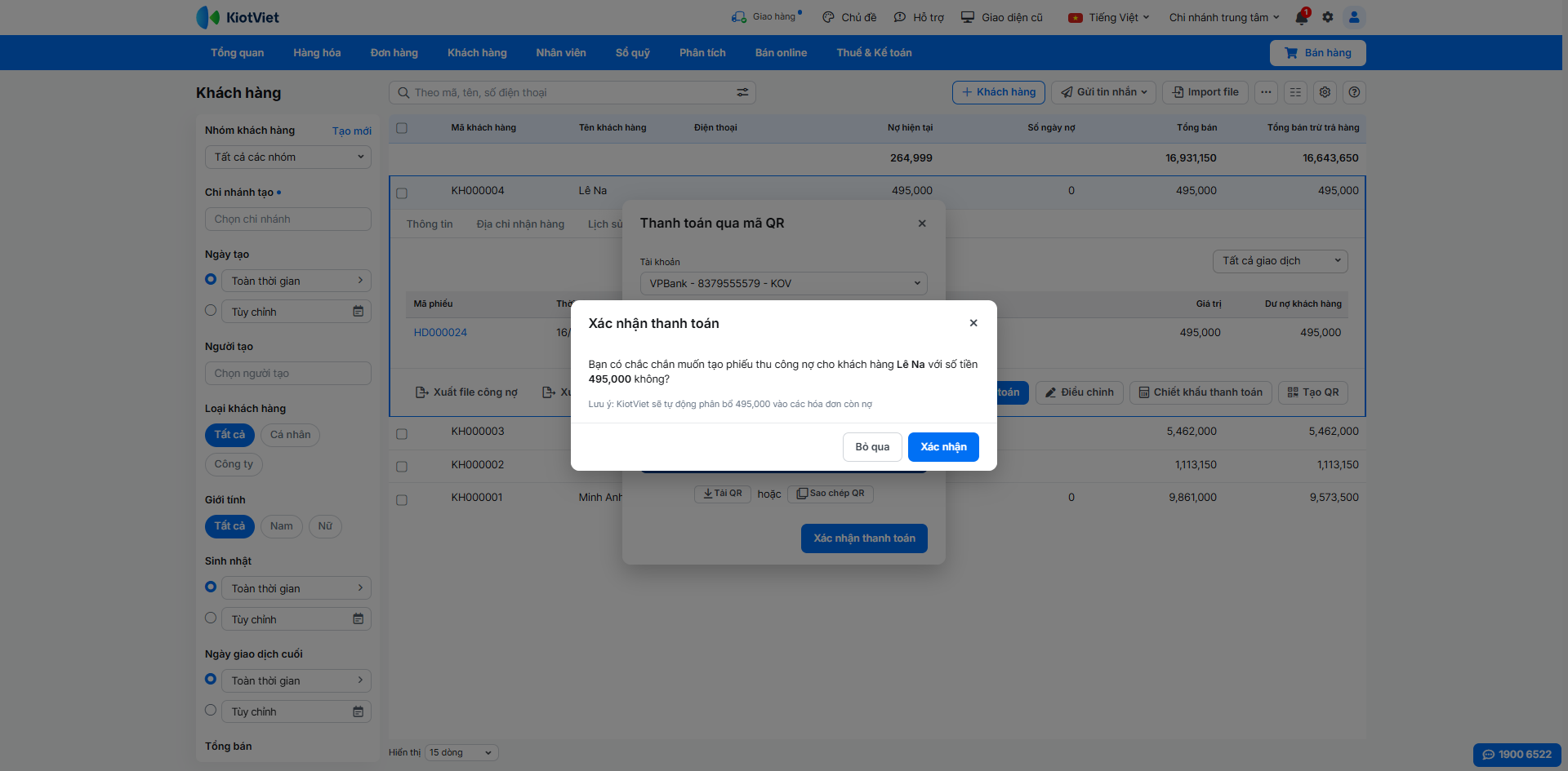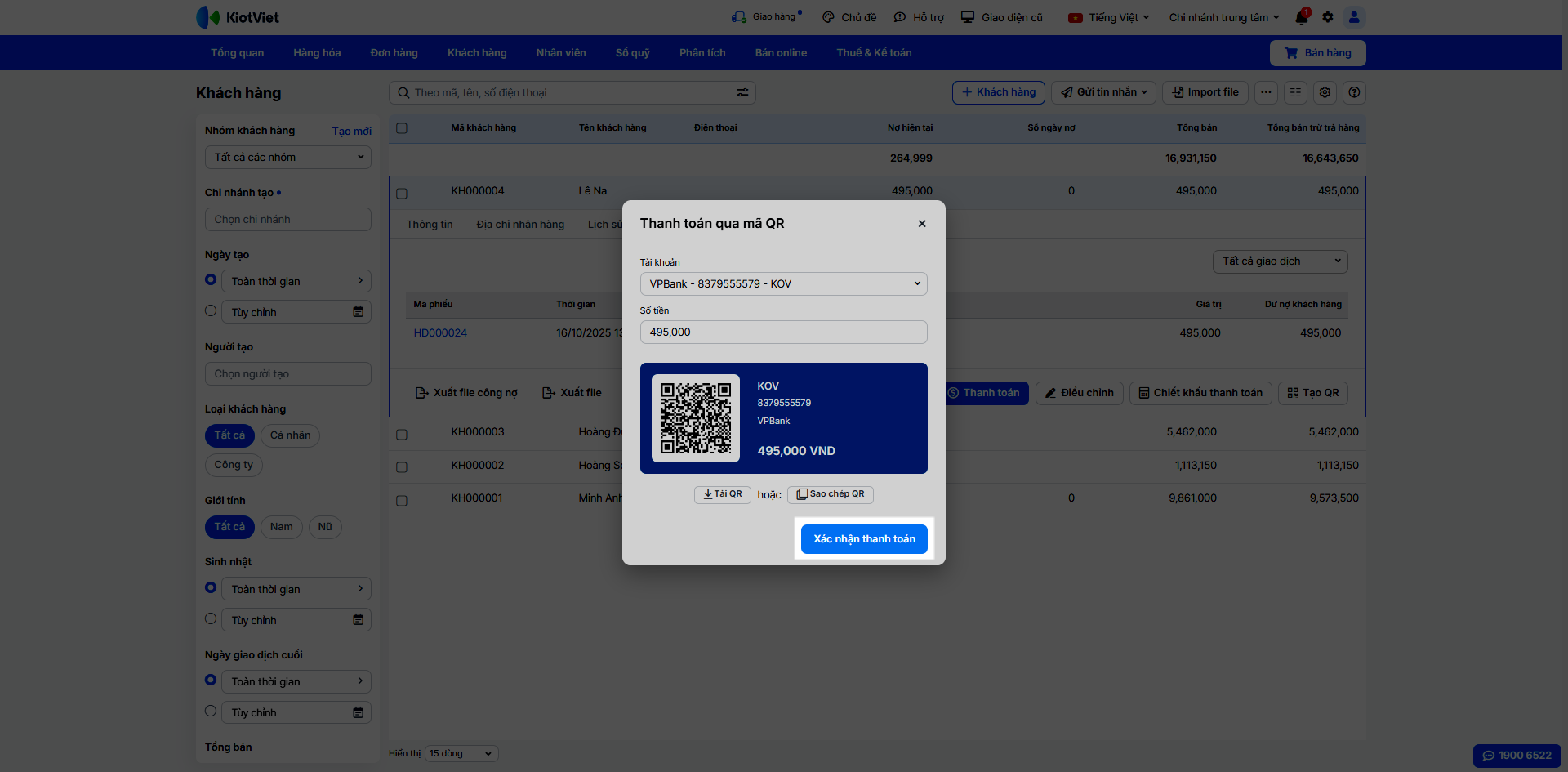 - Đối với tài khoản CHƯA đăng ký nhận thông báo thanh toán QR → khi nhận tiền của khách thành công, bạn nhấn Xác nhận thanh toán → tiếp tục nhấn Xác nhận để hệ thống tạo phiếu thu công nợ cho khách.