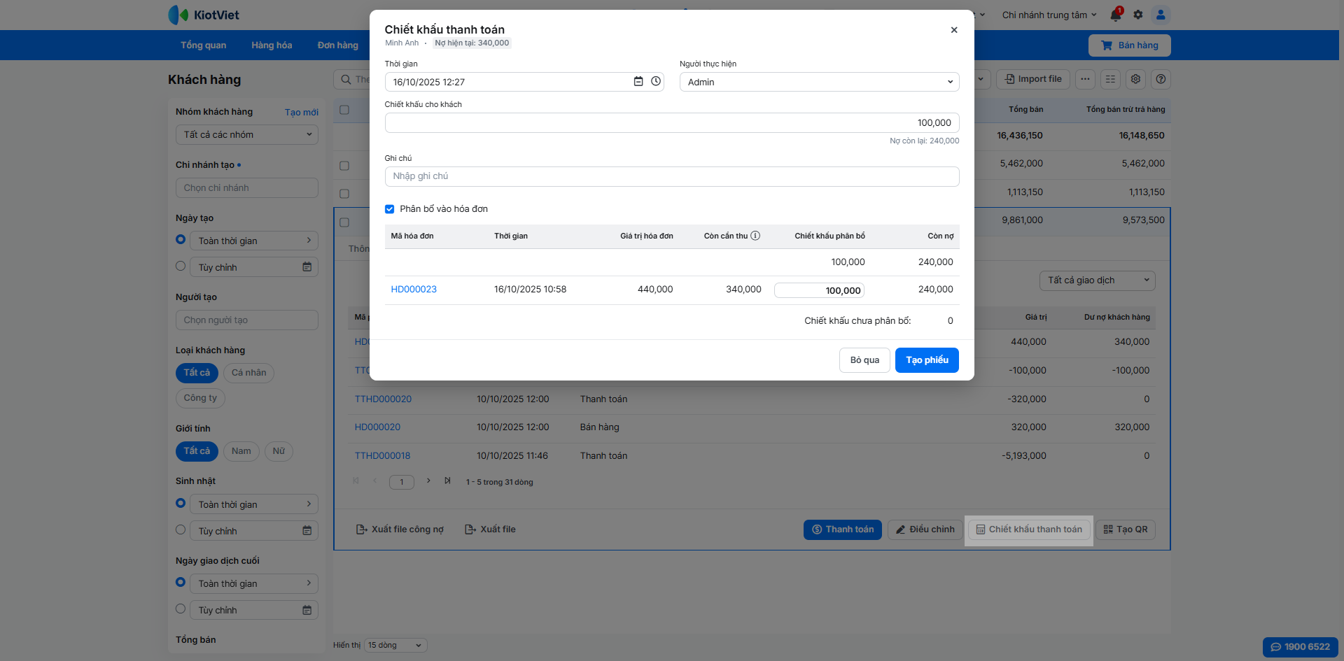- Nhấn Tạo phiếu để hoàn tất. Phiếu chiết khấu sẽ được ghi nhận như một khoản giảm trừ công nợ.