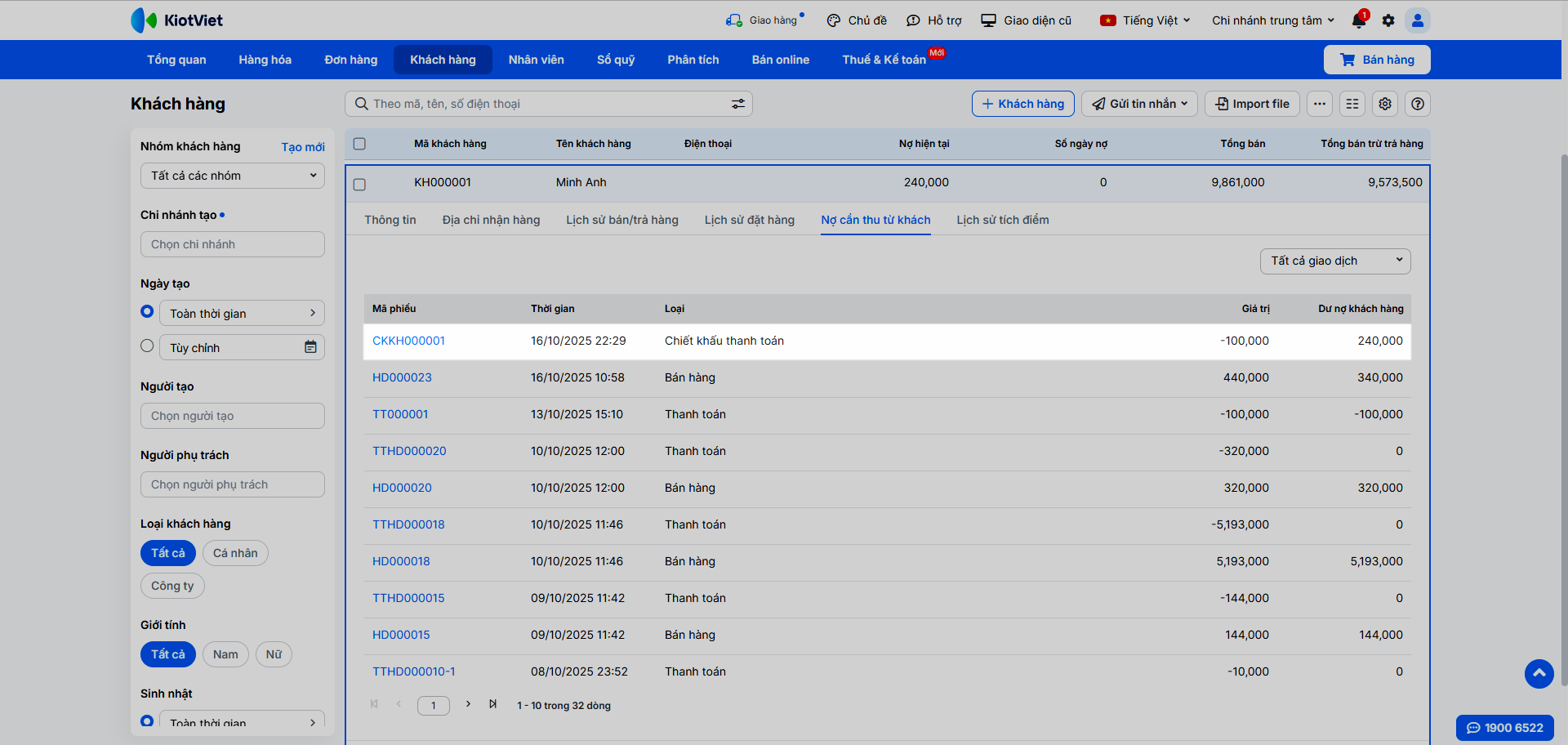 - Hỗ trợ chủ cửa hàng và kế toán kiểm soát công nợ chặt chẽ: Theo dõi chi tiết lịch sử mua hàng, trả hàng và các khoản thanh toán của từng khách hàng. Hệ thống cho phép quản lý công nợ, tạo phiếu thu và thiết lập cảnh báo tự động khi khách hàng nợ quá hạn mức.