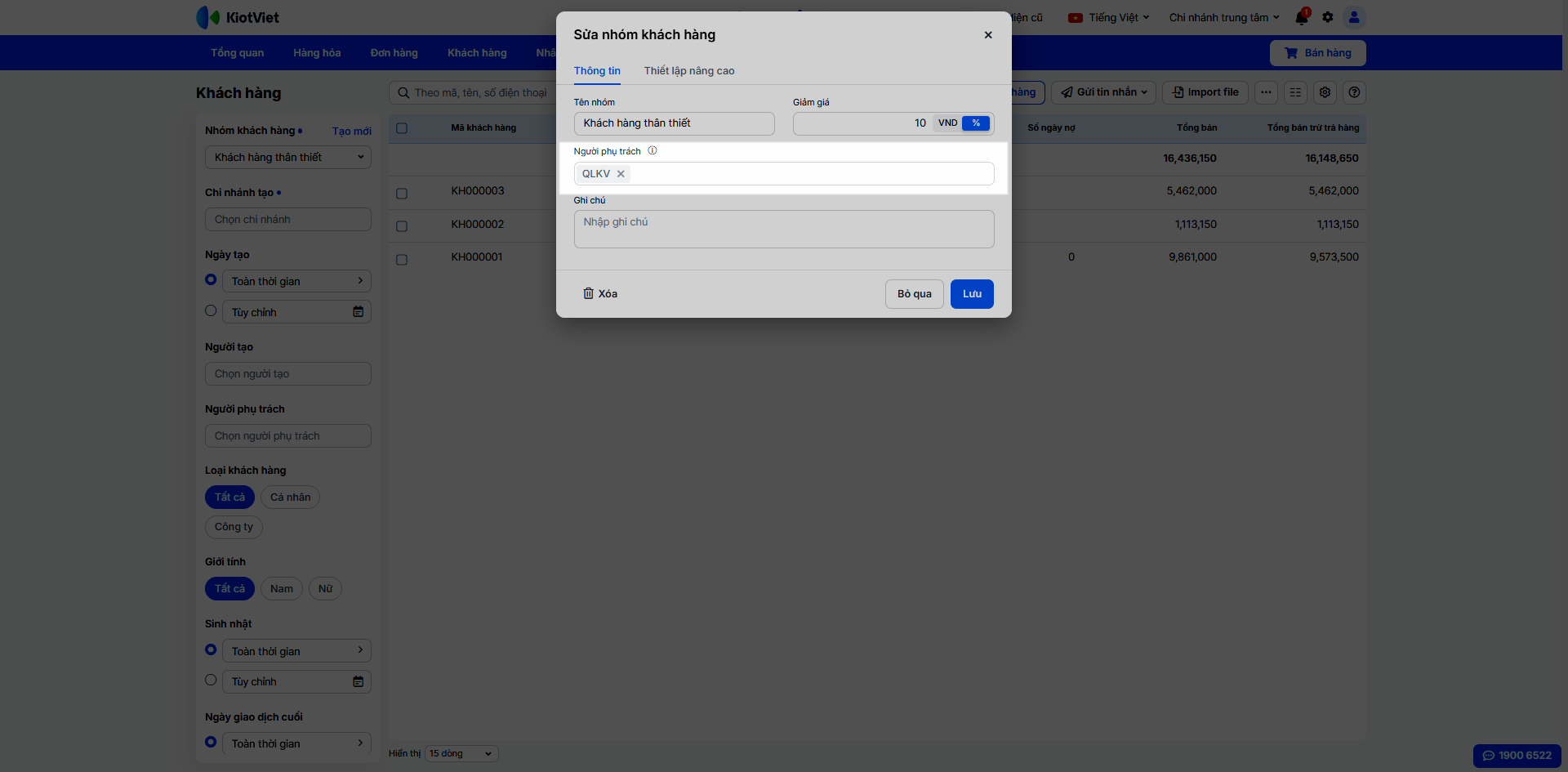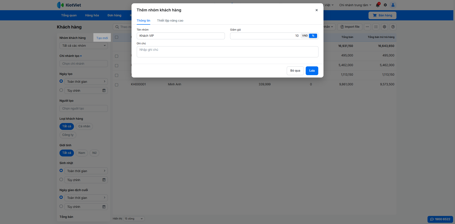 - Khi tạo/sửa nhóm khách hàng, chọn tab Thiết lập nâng cao.