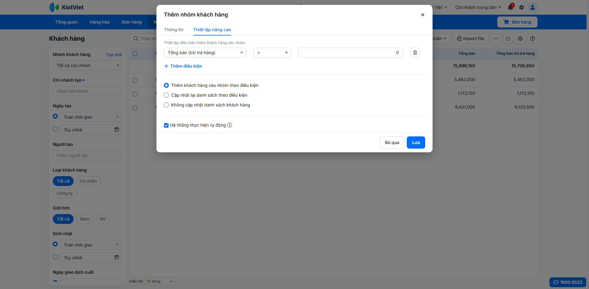 - Tích vào tùy chọn Hệ thống thực hiện tự động để KiotViet tự động thêm/xóa khách hàng khỏi nhóm khi họ thỏa mãn hoặc không còn thỏa mãn điều kiện.