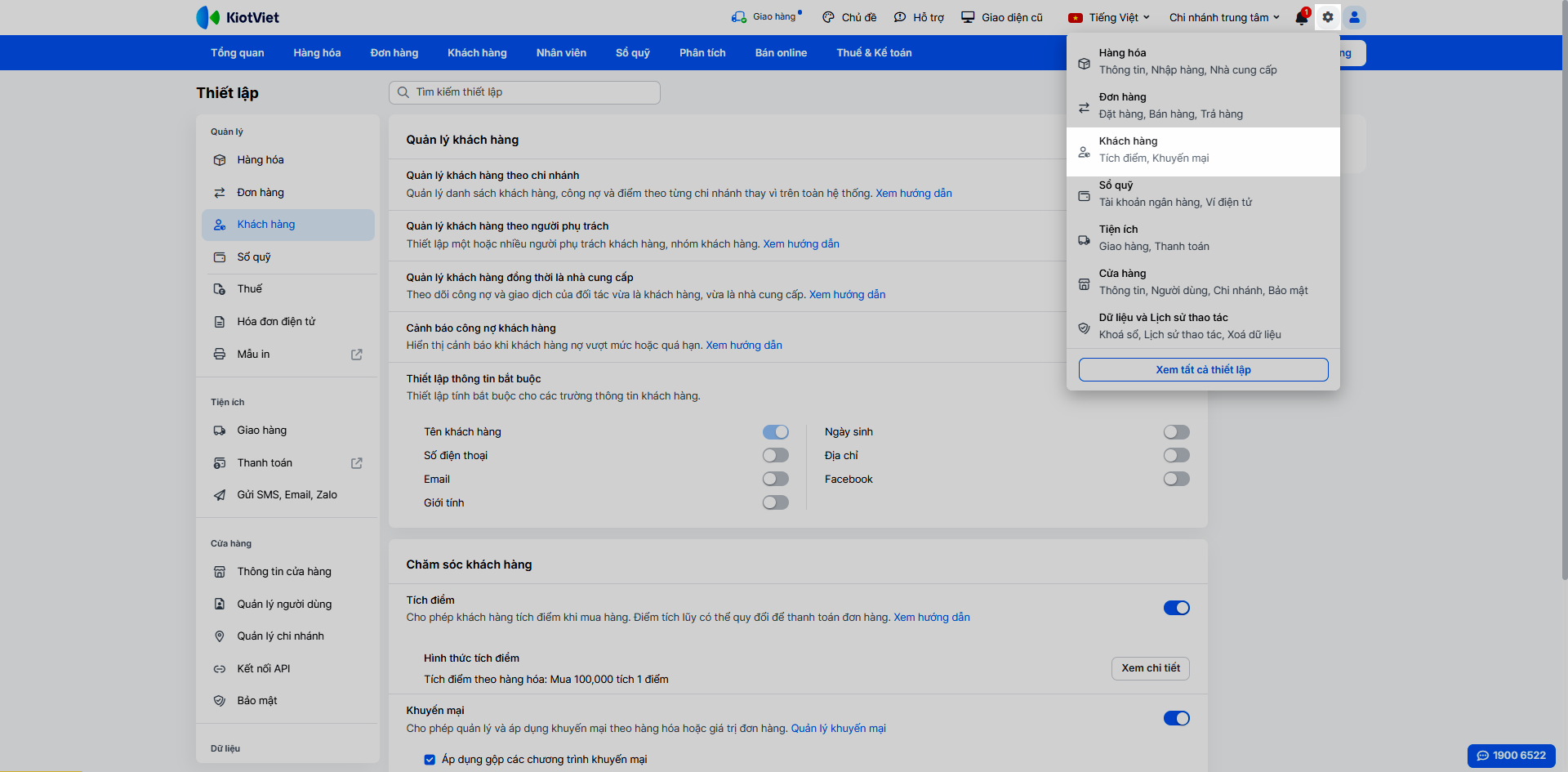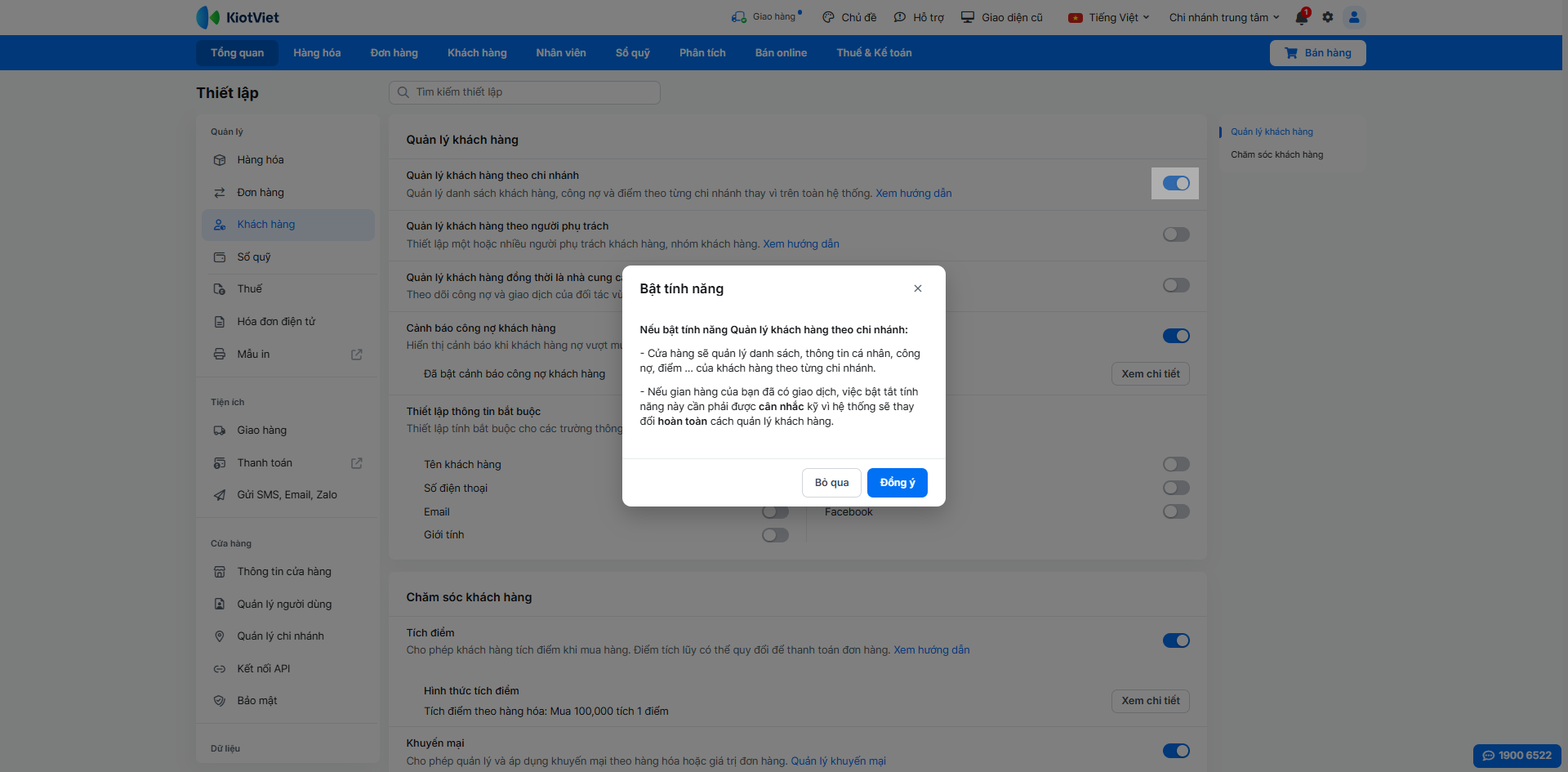- Bật tính năng Quản lý khách hàng theo chi nhánh → đọc kỹ thông tin và xác nhận Đồng ý.