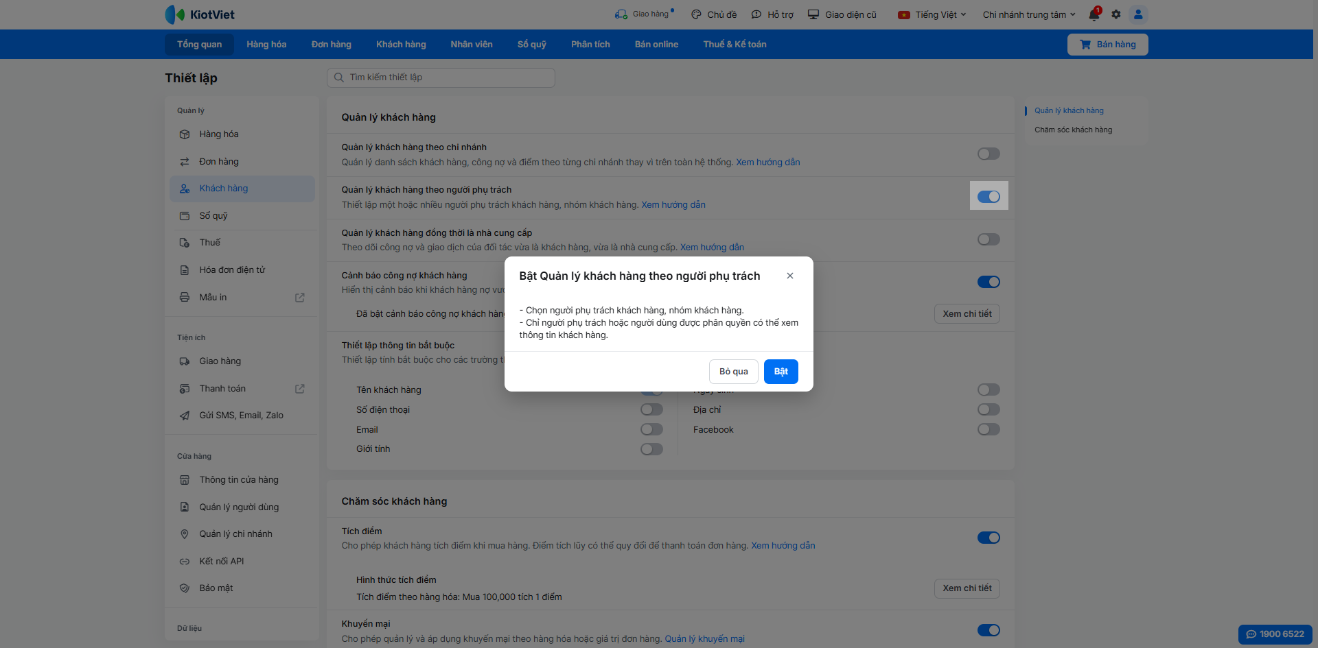 - Bật tính năng Quản lý khách hàng theo người phụ trách → đọc kỹ thông tin và xác nhận Bật.