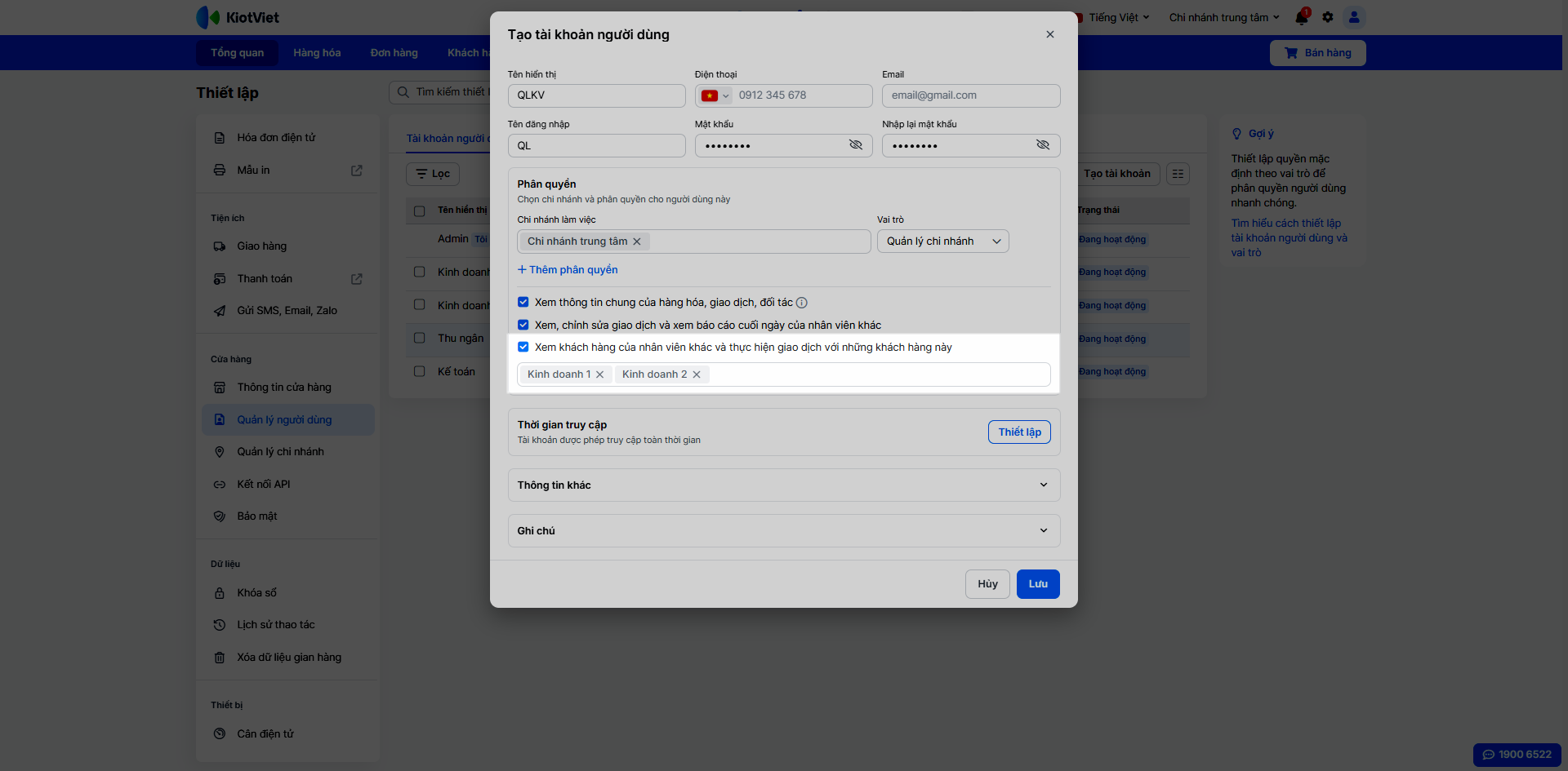 - Xem khách hàng của nhân viên khác và thực hiện giao dịch với những khách hàng này: Tích chọn để cho phép người dùng này (khi có quyền Xem Khách hàng) xem được: