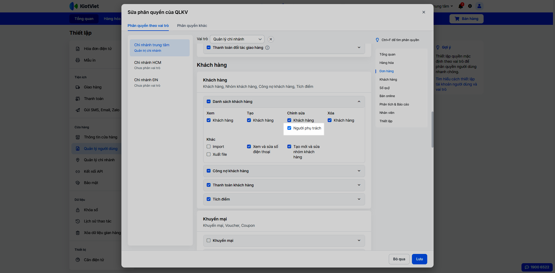 - Quyền Chỉnh sửa người phụ trách: Tại tab Phân quyền, trong mục Khách hàng → tích chọn tùy chọn này để cho phép người dùng gán, thay đổi hoặc xóa người phụ trách cho khách hàng.
