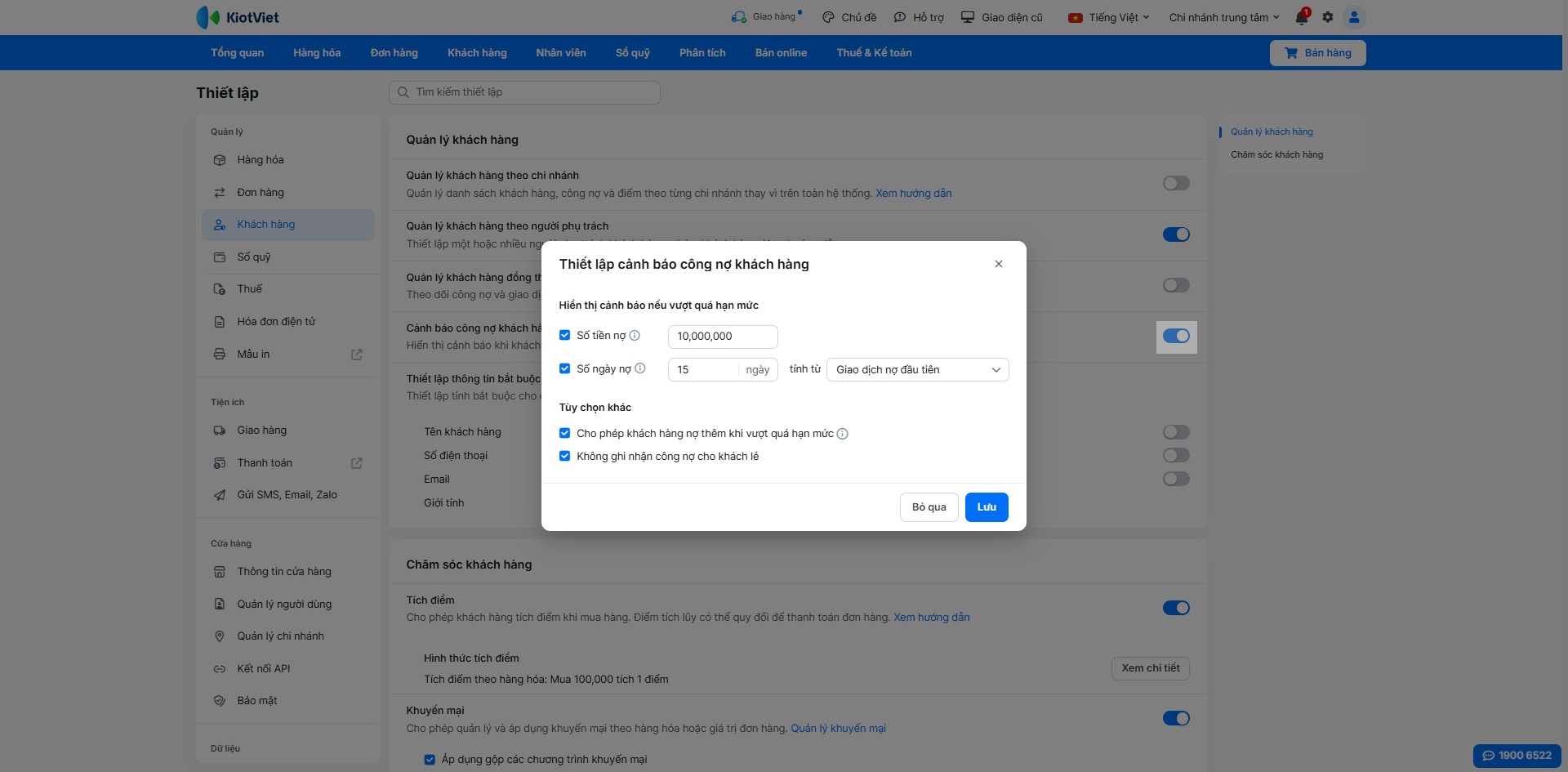 - Tích chọn: chỉ cảnh báo và tiếp tục cho phép khách hàng nợ thêm.