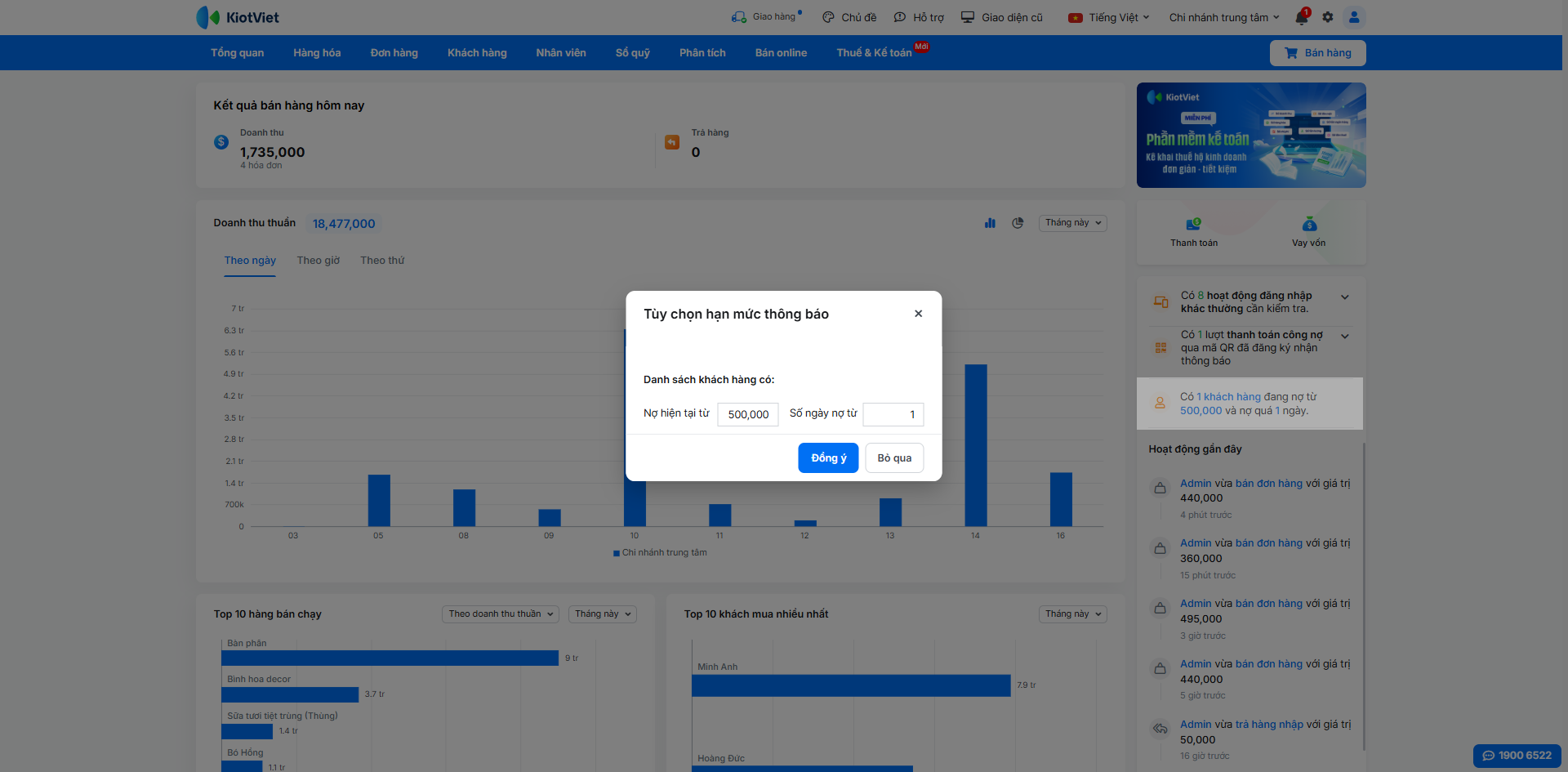 - Bạn có thể thay đổi hạn mức hiển thị thông báo khi kích vào giá trị nợ hoặc số ngày nợ. Hạn mức cảnh báo công nợ trên màn hình Tổng quan được tách biệt với hạn mức trong Thiết lập và không làm ảnh hưởng đến giao dịch của khách hàng.
