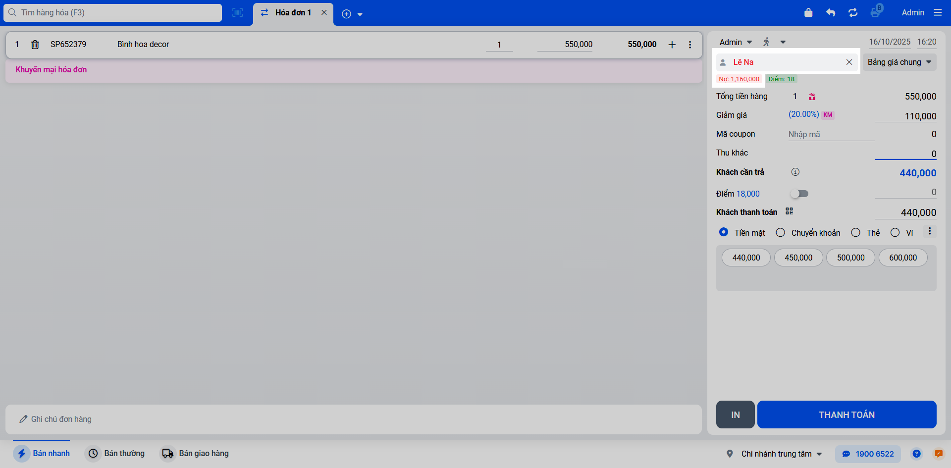 - Tra cứu và chọn: Sử dụng ô tìm kiếm để nhập tên, mã hoặc SĐT để tìm và chọn khách hàng.