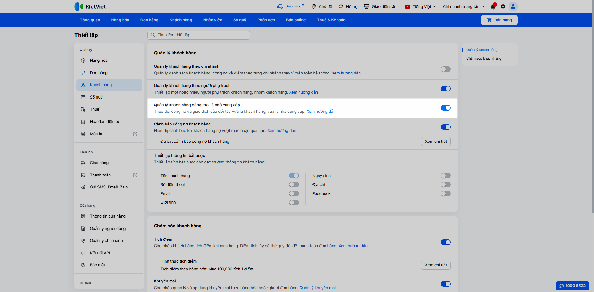 - Kích hoạt tính năng: Vào Thiết lập → Khách hàng và bật Quản lý khách hàng đồng thời là nhà cung cấp.