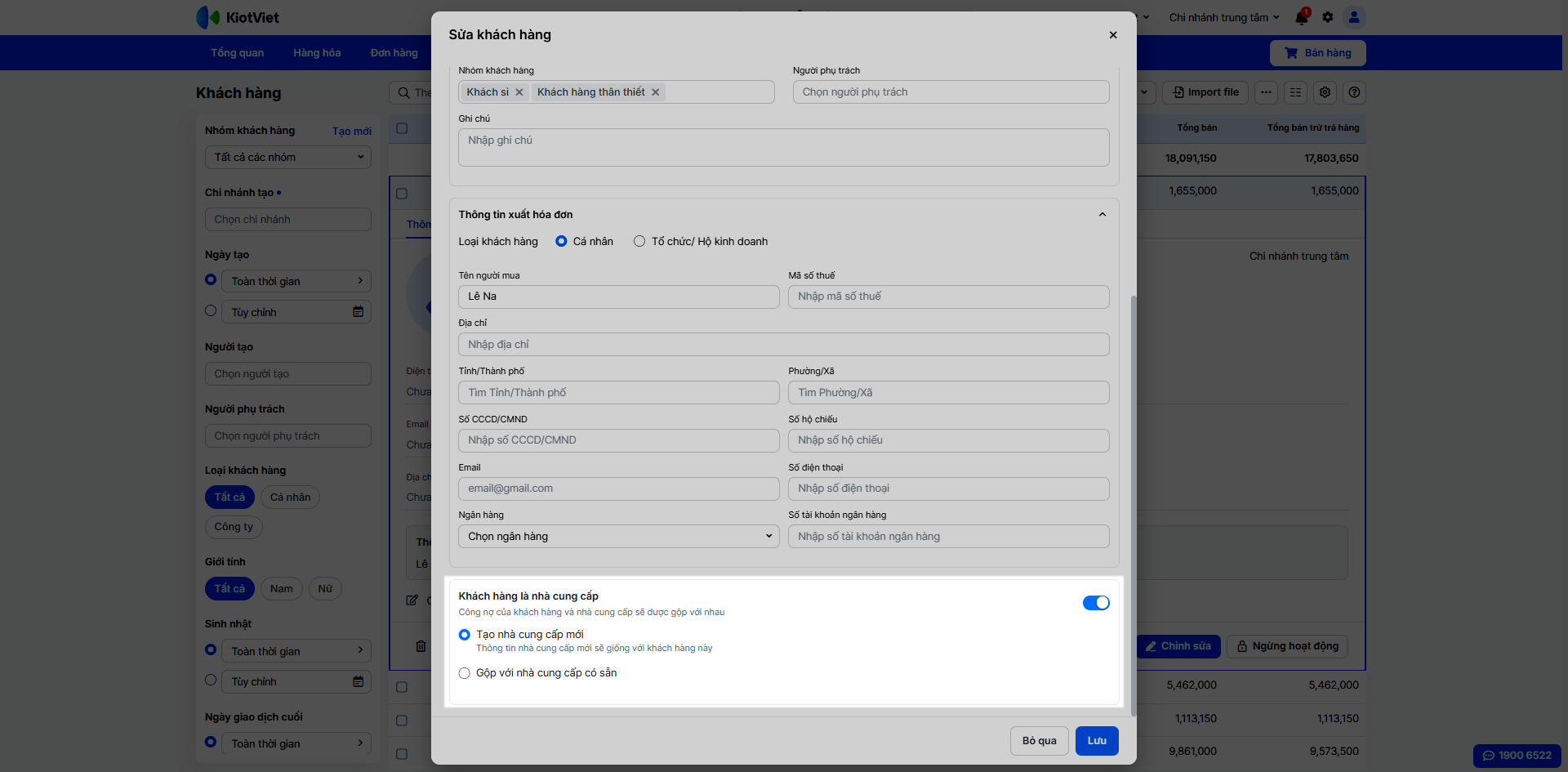 - Khi thêm mới hoặc chỉnh sửa một khách hàng, bật xanh Khách hàng là nhà cung cấp.