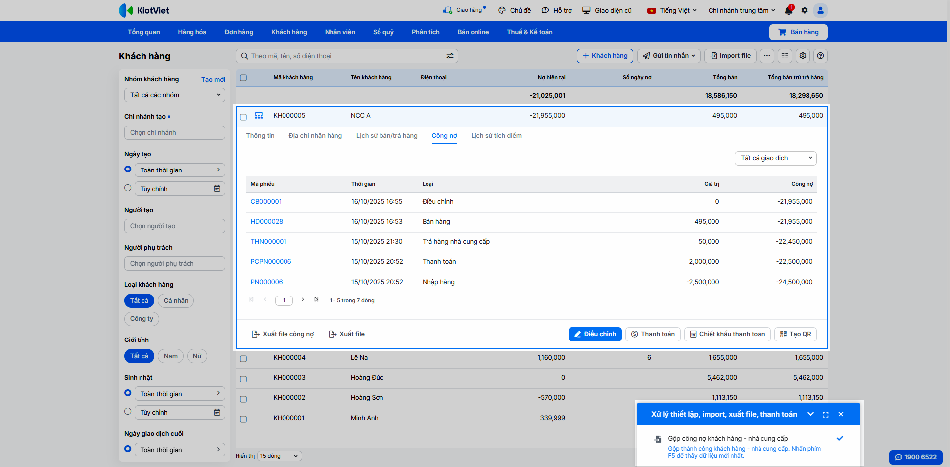 Tính năng Quản lý Khách hàng là công cụ trung tâm giúp bạn lưu trữ, theo dõi và tương tác với tất cả khách hàng của mình một cách hệ thống. Tính năng này cho phép bạn quản lý thông tin chi tiết, lịch sử giao dịch, công nợ và phân loại khách hàng để đưa ra các chiến lược kinh doanh và chăm sóc hiệu quả.