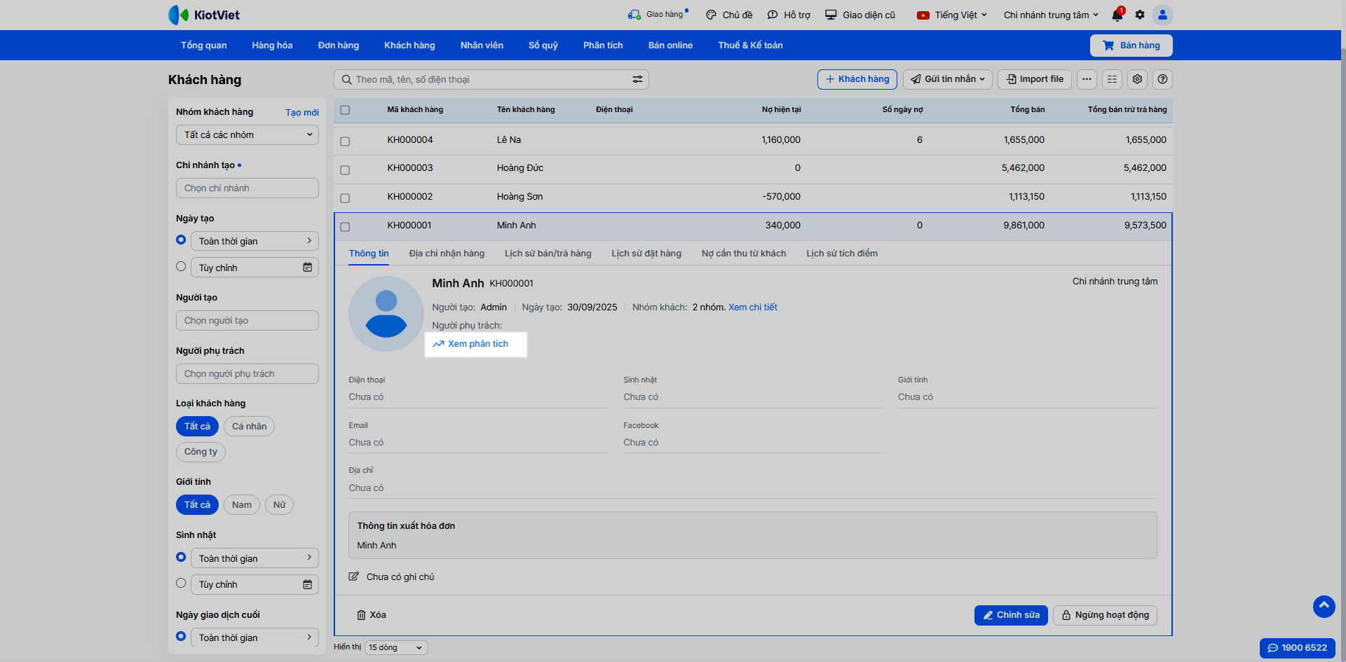 - Mở chi tiết khách hàng chọn Xem phân tích.