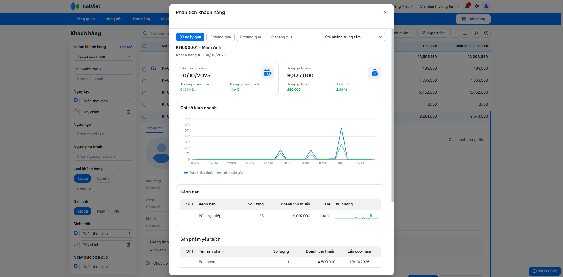 - Biểu đồ Chỉ số kinh doanh: Thể hiện doanh thu thuần và lợi nhuận khách hàng mang lại theo thời gian.