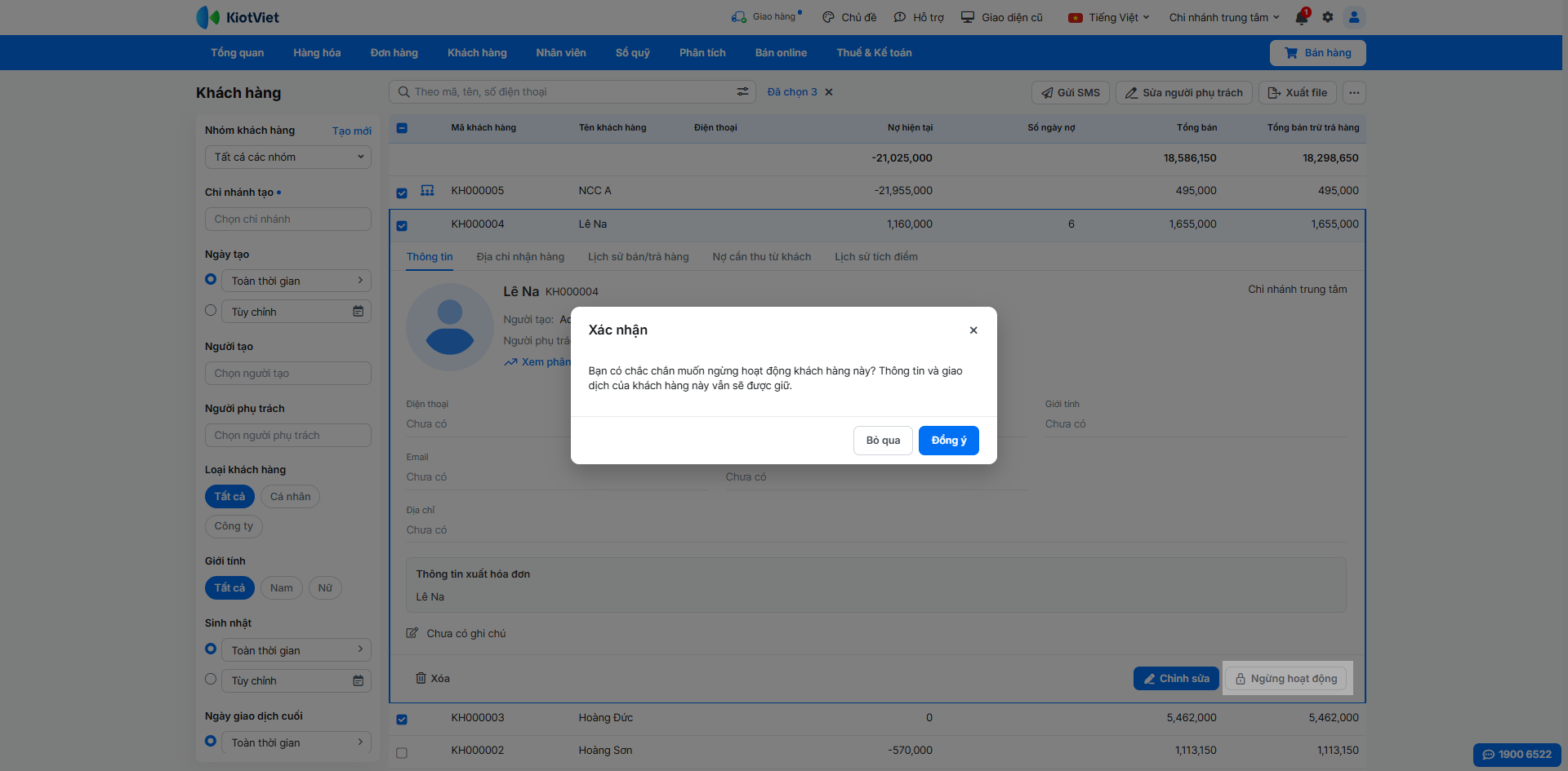 - Những khách hàng này sẽ không thể thực hiện giao dịch mới nhưng thông tin và lịch sử vẫn được lưu lại. Bạn có thể Cho phép hoạt động lại sau.