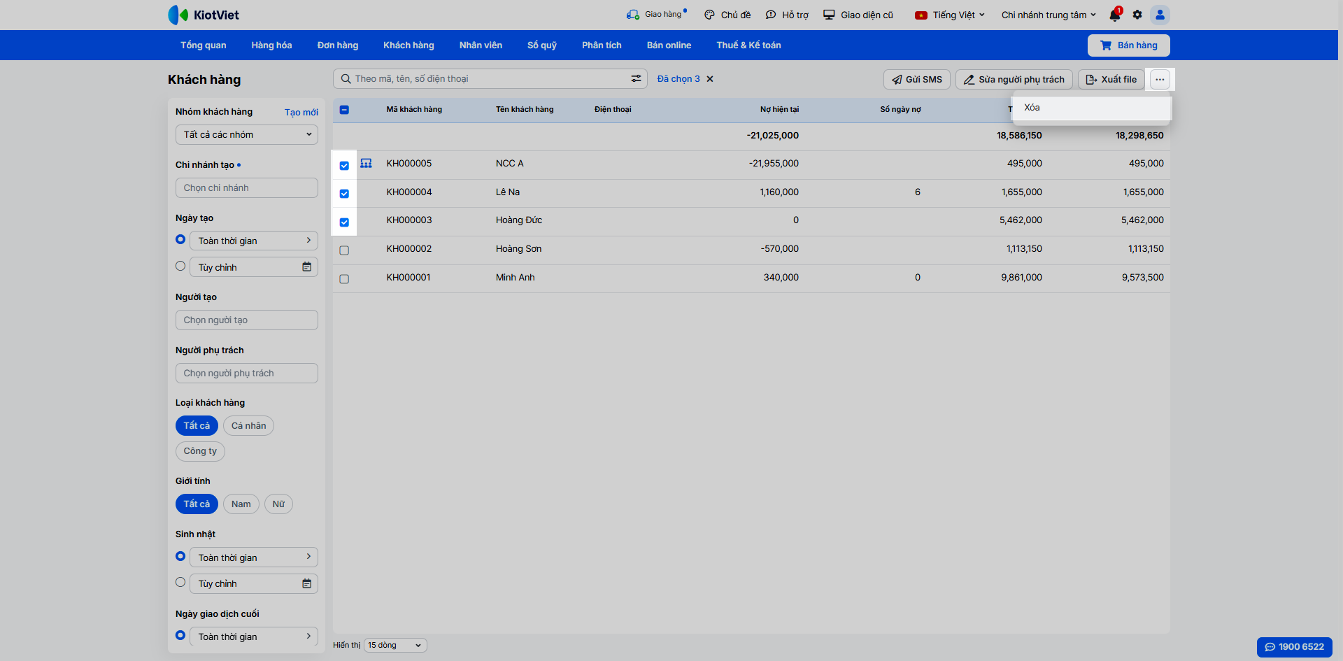 - Bạn có thể tích chọn nhiều khách hàng muốn xóa hàng loạt → nhấn 3 chấm → Xóa