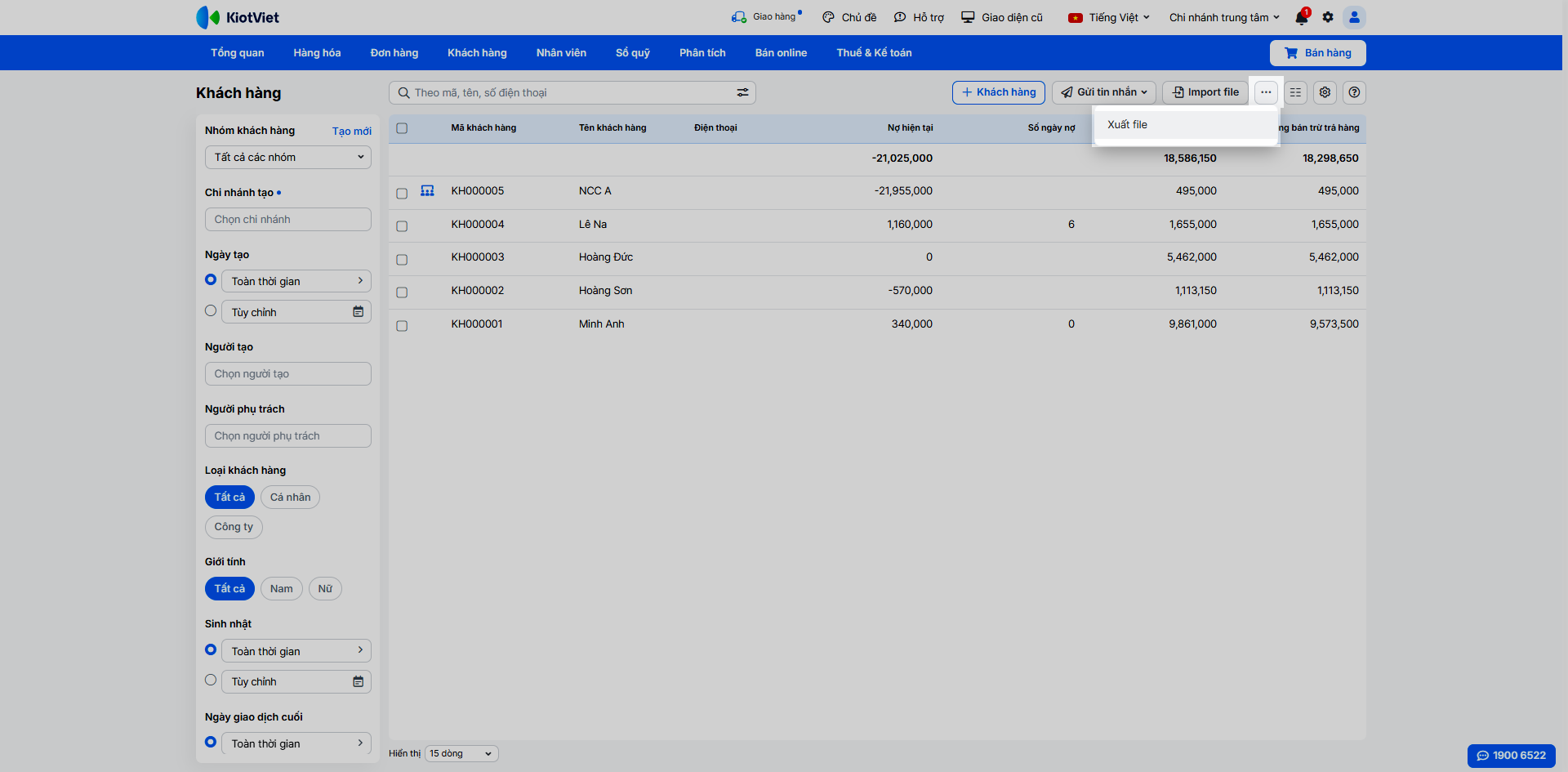 - Trên danh sách Khách hàng → nhấn Xuất file.