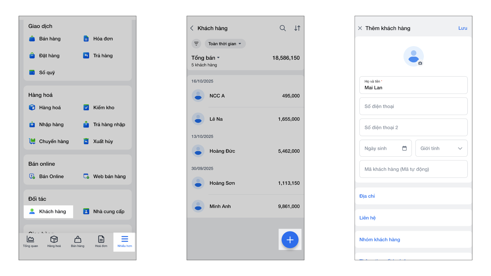 - Thêm mới: Vào menu Nhiều hơn → Khách hàng → chạm vào biểu tượng +. Điền thông tin và Lưu.