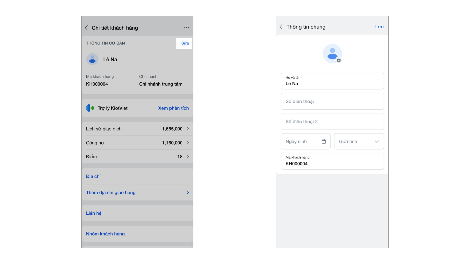- Cập nhật: Khi xem chi tiết khách hàng, tại mỗi khu vực thông tin, chạm vào Sửa, cập nhật thông tin và chạm Lưu.