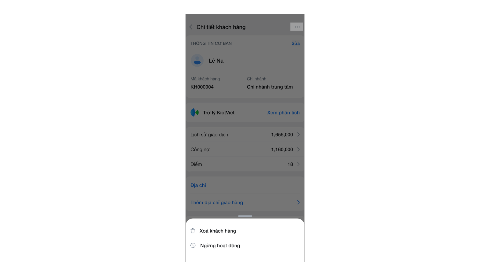 - Ngừng hoạt động/Xóa khách hàng: Mở chi tiết khách hàng, chạm vào biểu tượng 3 chấm để chọn các thao tác tương ứng.